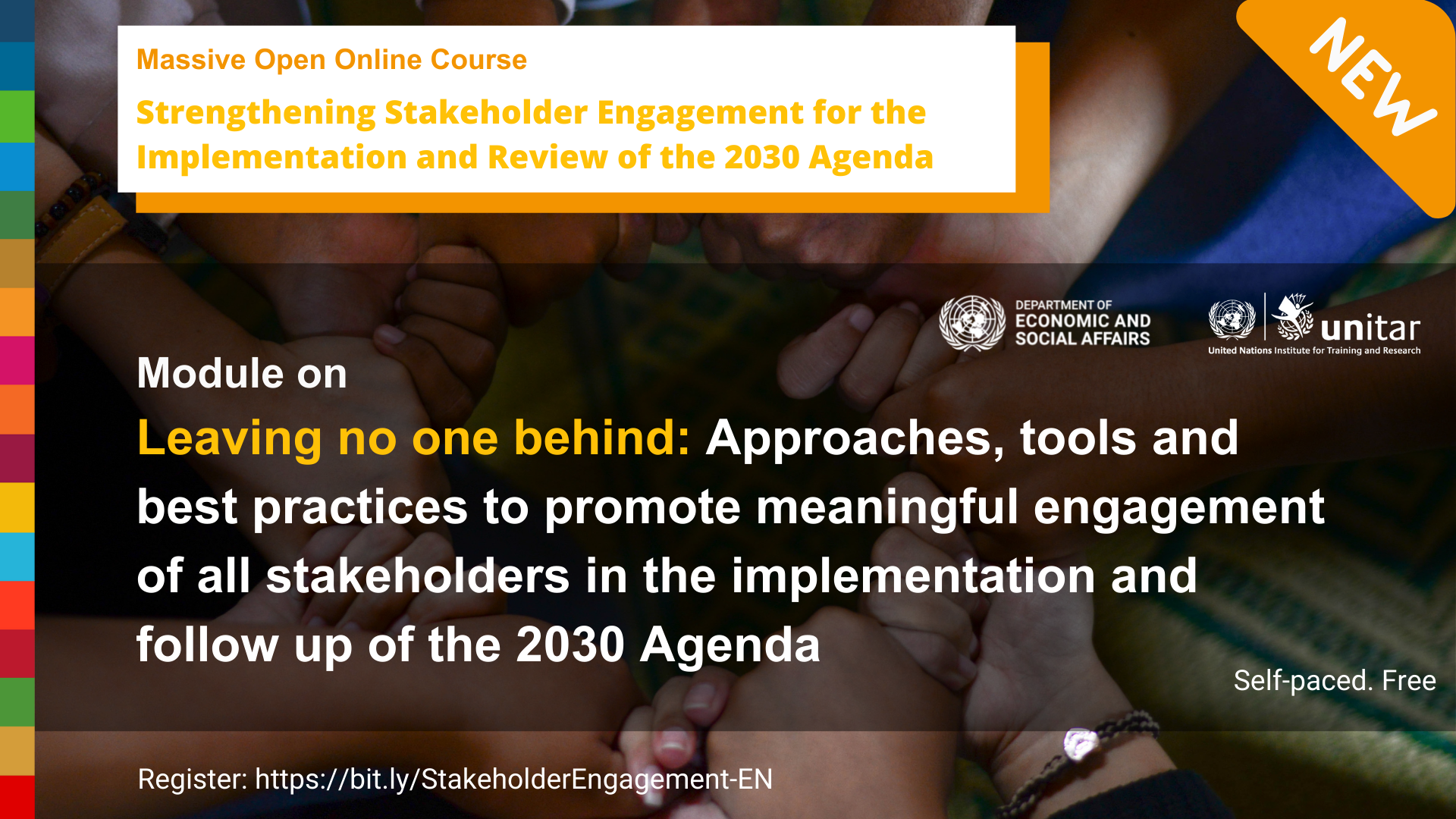 A new Module focusing on “Leaving no one behind: Approaches, tools and best practices to promote meaningful engagement of all stakeholders in the implementation and follow up of the 2030 Agenda” of the Massive Open Online Course (MOOC) on Strengthening Stakeholder Engagement for the Review and Implementation of the 2030 Agenda is now available.