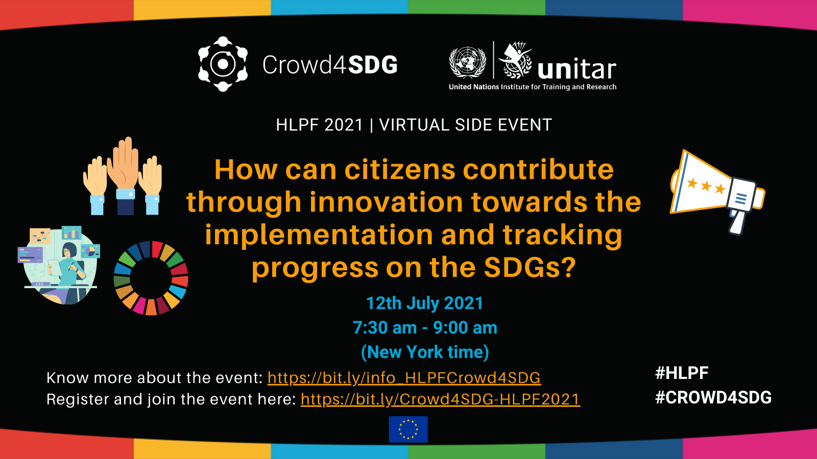 12 July 2021, Geneva, Switzerland - Achieving SDGs is the responsibility of not only governments but of everyone else – every citizen. There are several ways to do so. Support with data collection and monitoring of progress on SDG implementation is one of them. National Statistical Offices (NSO) have been experimenting with different new sources of data to bridge the data gaps to be able to track progress on the SDGs. This side event, on 12 July 2021, on the sidelines of the 2021 High-level Political Forum on Sustainable Development (HLPF) aimed to demonstrate how exactly citizens can make their contributions through innovative solutions and how such citizen science or citizen-generated data can be of use to the National Statistical Offices (NSOs). The event was organized by the United Nations Institute for Training and Research (UNITAR) together with members of the Crowd4SDG Consortium, University of Geneva, Politecnico di Milano, CERN, Spanish National Research Council, and Université de Paris.