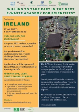 The 2022 E-Waste Academy – Scientist Edition (EWAS) is coming to Limerick in August-September 2022. The upcoming EWAS, organized by UNU-UNITAR SCYCLE, is part of a broader initiative – managed by the United Nations Industrial Development Organization (UNIDO), with the financial support from the Global Environment Facility (GEF).