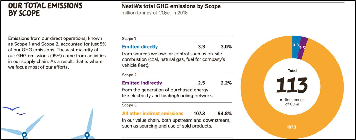 There are more challenges laying in Scope 3 emissions. Across industries, 85% of the emissions fall into Scope 3, in some industries even much more, as the example of Nestlé SA shows: