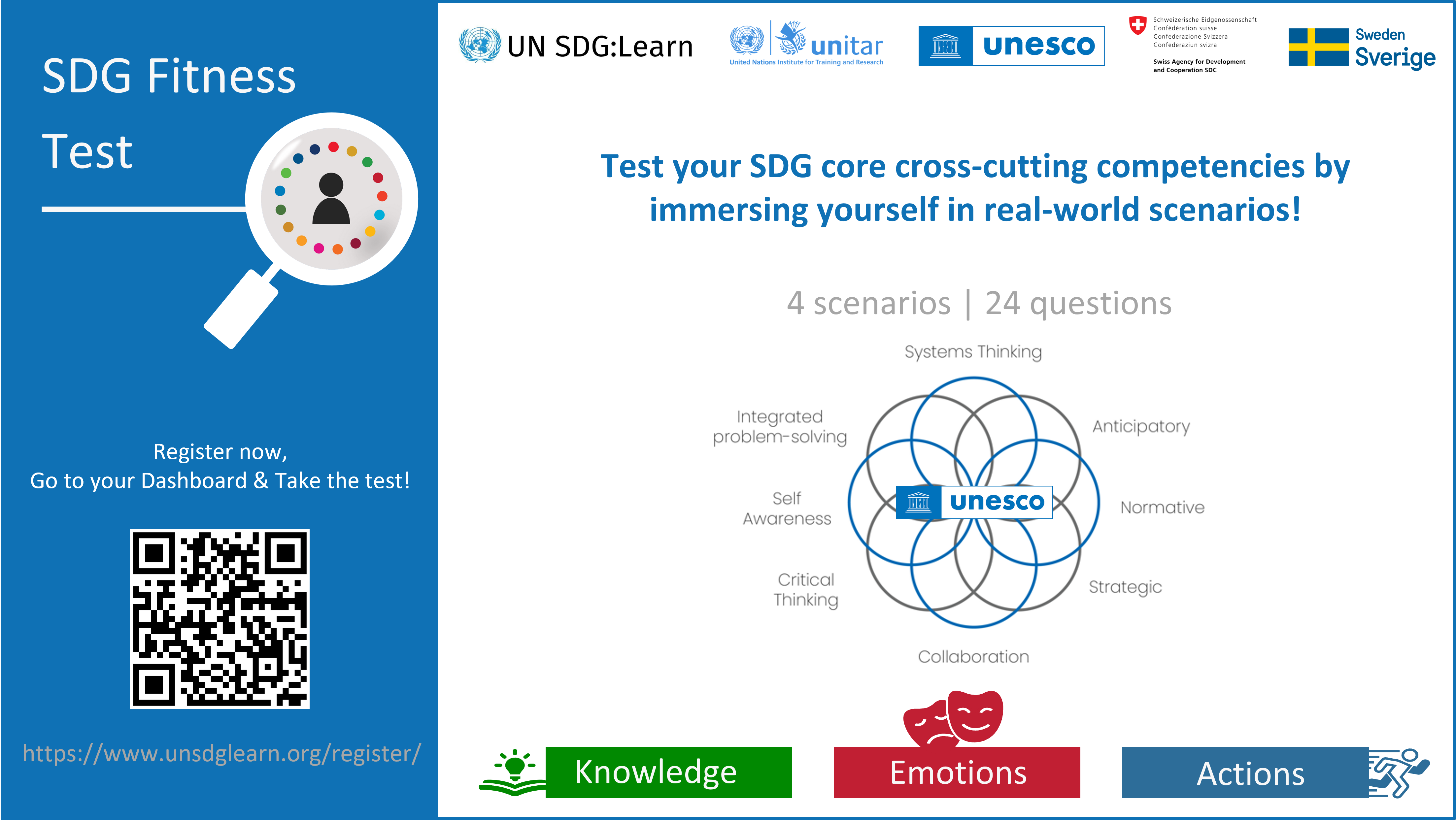 With contributions of UN SDG:Learn partners, particularly UNESCO, as well as professors from the Arizona State University, a new assessment tool has been developed. It is called SDG Fitness Test which helps assess on how well you are doing on SDG core cross-cutting competencies through immersing yourself in real-world scenarios.
