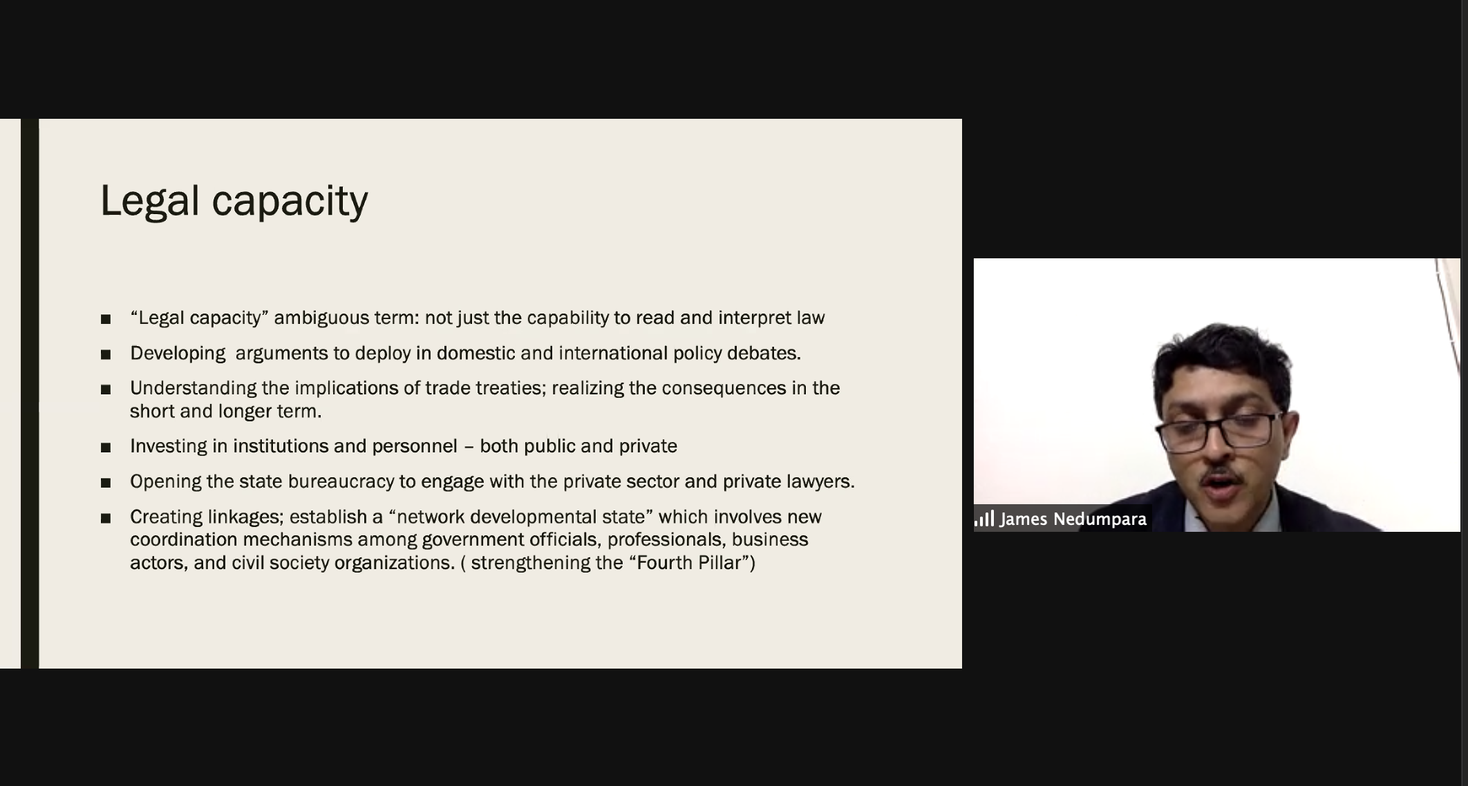 The session was continued by Professor Dr. James Nedumpara Head of the Centre for International Trade and Investment Law, India. He explained the importance of building legal capacity. Dr. Nedumpara stressed the importance of proper evaluation of the domestic policies and stressed the need for training and capacity building programmes to enhance awareness. He discussed the roles of domestic institutions while providing examples. Dr. Nedumpara and Ms. Brandon ended the session with a joint Q&A discussion with the participants.