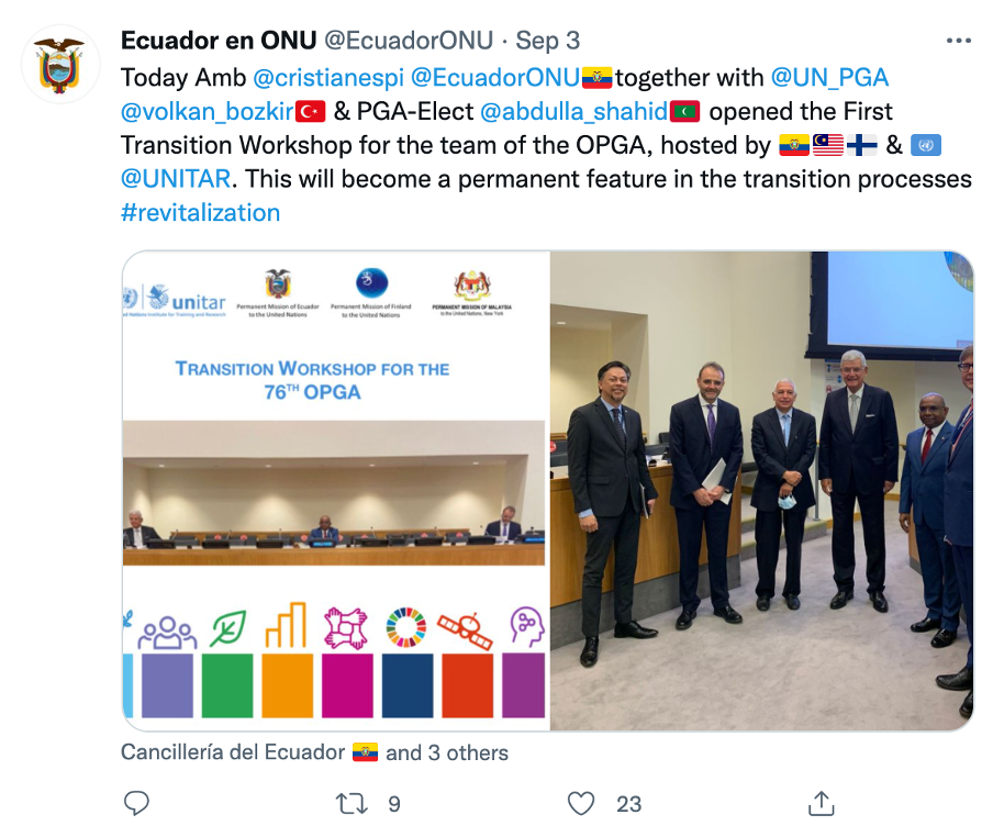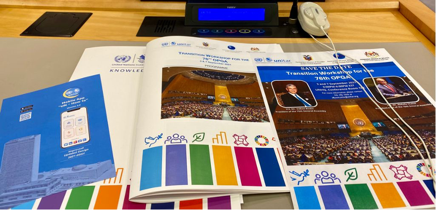 7 September 2021, New York, USA – The United Nations Institute for Training and Research (UNITAR) New York Office successfully implemented its two-day training, the “Transition Workshop for the 76th Office of the President of the General Assembly (OPGA),” in partnership with the Permanent Missions of Ecuador, Finland, and Malaysia. This workshop was organized to support the Office of the President of the General Assembly in its transition between the 75th and 76th OPGA, and to specifically facilitate opportunities for existing, former, and incoming OPGA staff to share experiences and best practices for a successful transition. This workshop marked UNITAR New York Office’s first in-person training workshop since the beginning of the COVID-19 pandemic and was attended by more than 30 delegates, following social distancing measures.
