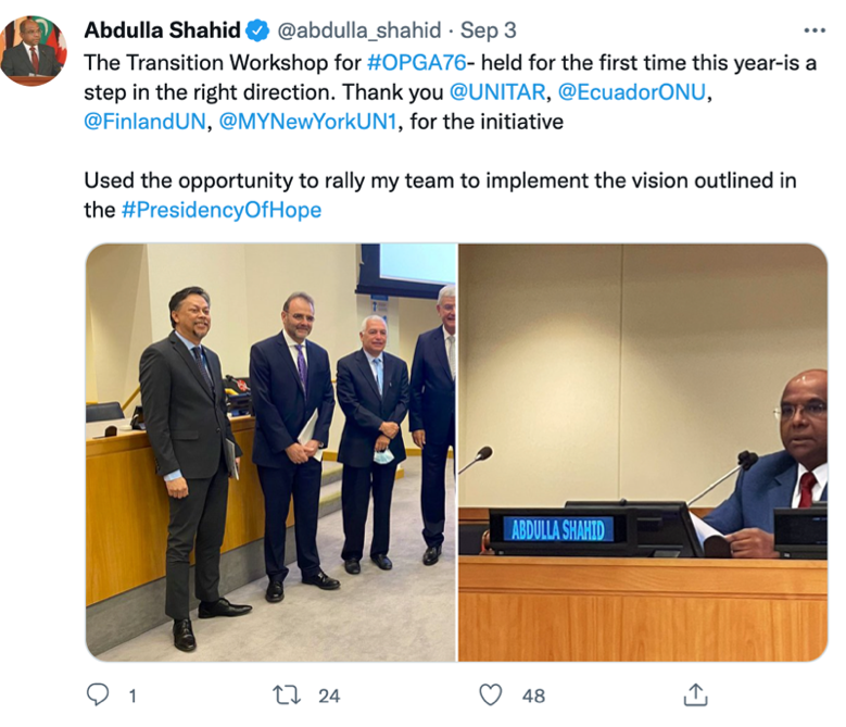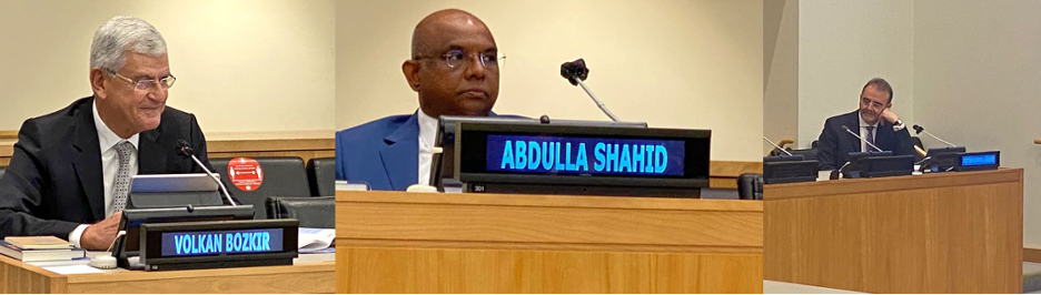 Mr. Suazo then gave the floor to the President-elect of 76th General Assembly, H.E. Mr. Abdulla Shahid. Mr. Shahid spoke that he believes in a stronger, empowered UNGA that is well-resourced and professionally staffed. He showed appreciation for PGA Bozkir and his team for achieving remarkable results during the pandemic, as well as for reopening the General Assembly. Mr. Shahid emphasized the need to raise the standard of the General Assembly and to continue strengthening OPGA. He acknowledged that the UN does not just want to receive reports detailing impacts, but also must hear about the ways in which the UN is bolstering ambition to support the many important causes it aids.