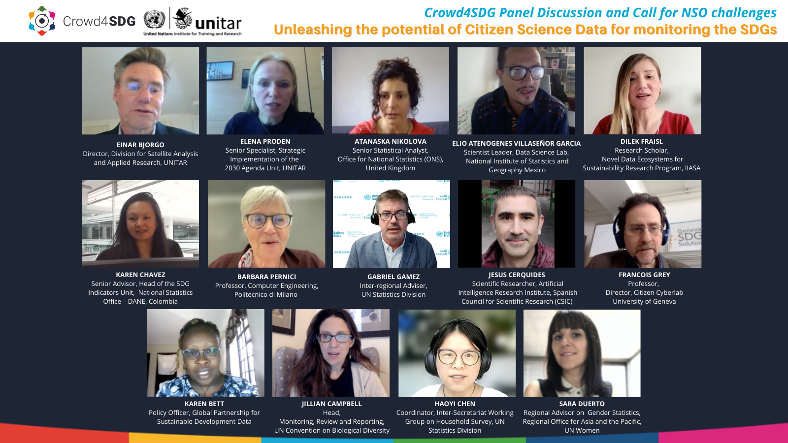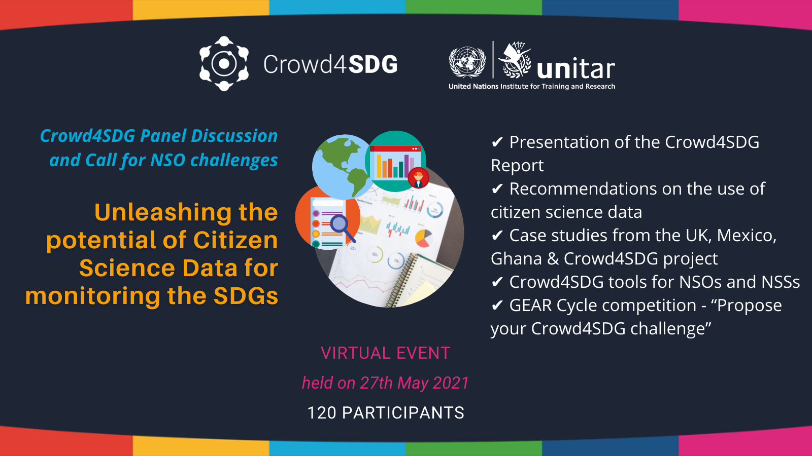On 27th May 2021, United Nations Institute for Training and Research (UNITAR), which is a partner in the EU-funded Crowd4SDG project, organised a panel discussion “Unleashing the potential of citizen science data for monitoring the Sustainable Development Goals (SDGs)” as part of the Crowd4SDG project. The panel had a two-fold objective – to disseminate emerging good practices among National Statistical Offices (NSOs) and National Statistical Systems (NSSs) on leveraging citizen science for monitoring progress on SDGs and related national and local level objectives, and to create space for discussing the needs of NSOs that could be addressed through concrete citizen science projects using a challenge-based approach. Aligned with this objective, the event was conducted in two parts. The first part focussed on the key findings and recommendations from the Crowd4SDG study and case studies on the use of citizen science data for monitoring SDGs. This was followed by the presentation of Crowd4SDG tools for citizen science, the discussion on the needs of NSOs and NSSs and a call for official statistics challenges for the Crowd4SDG citizen science competition to open in summer 2021.