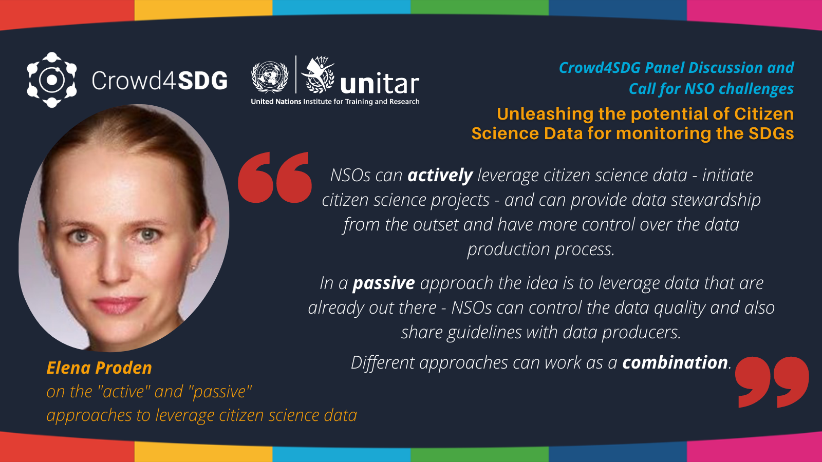 Following the introduction by Mr. Einar Bjorgo (Director, Division for Satellite Analysis and Applied Research, UNITAR) moderating the first part of the Panel Discussion, Ms Elena Proden (Senior Specialist, Strategic Implementation of the 2030 Agenda Unit, UNITAR) presented key findings and recommendations from the Crowd4SDG report on the use of citizen science data for monitoring the SDGs. The study was carried out with the guidance from the Advisory Group with the most members present in the event. As one of the key highlights, she shared two emerging approaches in the use of citizen data, namely “active and passive “approaches. In the former approach, “NSOs can pro-actively initiate citizen science data projects providing data stewardship from the outset with more control over the data production process. In a passive approach, the idea is to leverage data that are already out there - NSOs can review and validate the data quality and also share guidelines with data producers. Different approaches can work as a combination”, - Ms. Proden explained. She further elaborated on the impediments most frequently experienced by those representatives of NSOs who worked with citizen science data, that included limited access to data, lack of legal frameworks to address relevant aspects and selection bias among others. The report also included good practices and potential areas of need, and the recommendations emphasised on covering quality related aspects.