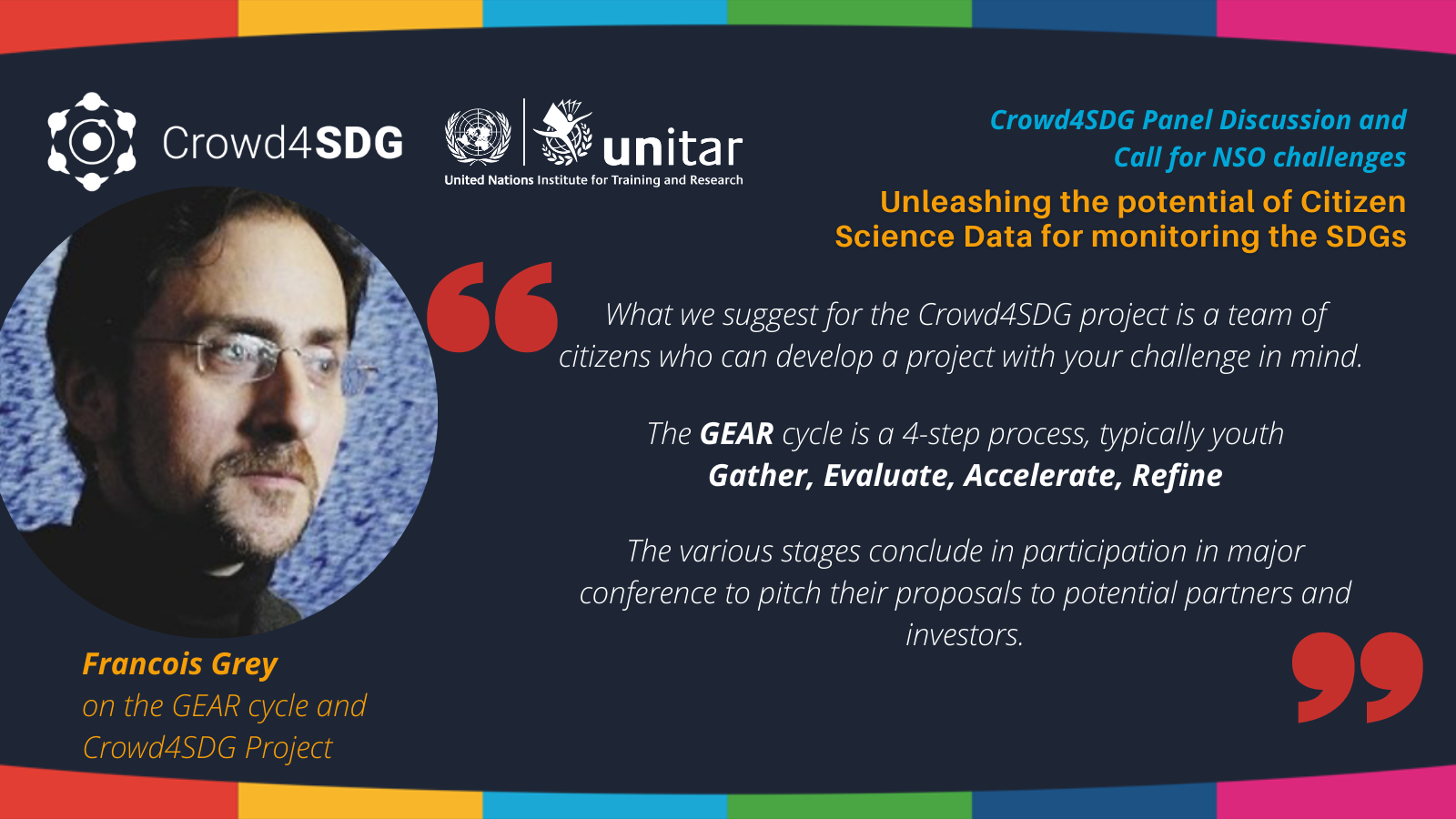 Opening up the next segment on the Crowd4SDG challenges, François Grey (Professor, University of Geneva and Director, Citizen Cyberlab), explained the methodology of the GEAR cycle (Gather, Evaluate, Accelerate and Refine), which is a 4-step process competition as one of the core activities of the Crowd4SDG projects run on an annual basis. It targets and encourages youth in coming up with innovative solutions to various challenges working in multidisciplinary teams of young professionals and students. Climate change/resilience and gender equality have been selected as the main focus of the upcoming GEAR Cycle 2.