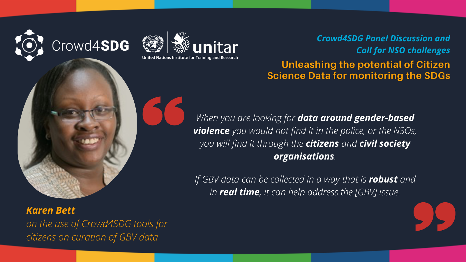 Following this GEAR Cycle 2 background, Mr. Gamez invited (six) discussants to the special segment to propose their data challenges to be included in the 2021 call for solutions. Ms. Karen Bett (Policy Officer, Global Partnership for Sustainable Development Data) proposed the challenge around collecting data on gender-based violence (GBV) during lockdowns across countries and talked to the pivotal role of citizen science data in this domain. She pointed out that “when you are looking for data around gender-based violence you would not find it in the police, or the NSOs, you will find it through the citizens and civil society organizations. If GBV data can be collected in a way that is robust and in real-time, it can help address the [GBV] issue”, highlighting that citizen science data was filling a gap crucial for any research on topics like GBV.