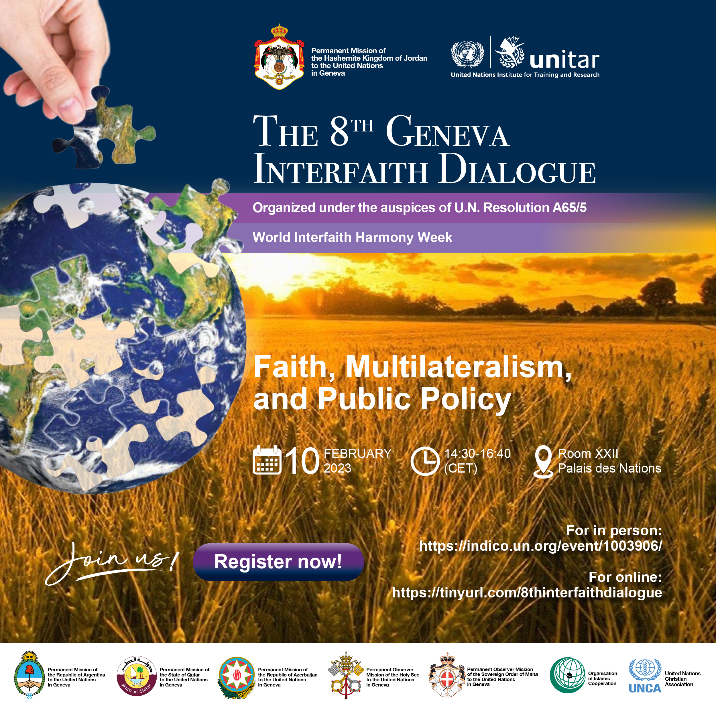 31 January 2023, Geneva, Switzerland- The Annual Geneva Interfaith Dialogue convenes a diverse panel of Ambassadors and other high-level representatives of the world’s major faiths, as well as the International Geneva community at large, to engage on the links between faith, politics, and society. The Dialogue is held on the premises of the United Nations Office in Geneva (UNOG) each year during World Interfaith Harmony Week. It serves as a platform not simply to commemorate UNGA Resolution 65/5, but as a vehicle to raise public awareness, renew the Resolution’s commitments, and build capacity for putting the Resolution’s values into practice across the world.