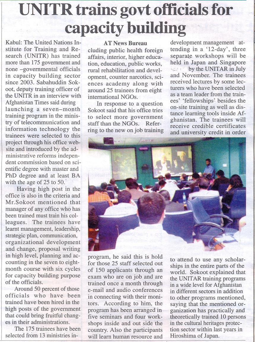 The Afghan Fellowship drew interest from local press as the Afghan Times newspaper decided to write an article on UNITAR's Fellowship in Afghanistan. The article focuses on UNITAR training government officials for capacity building.