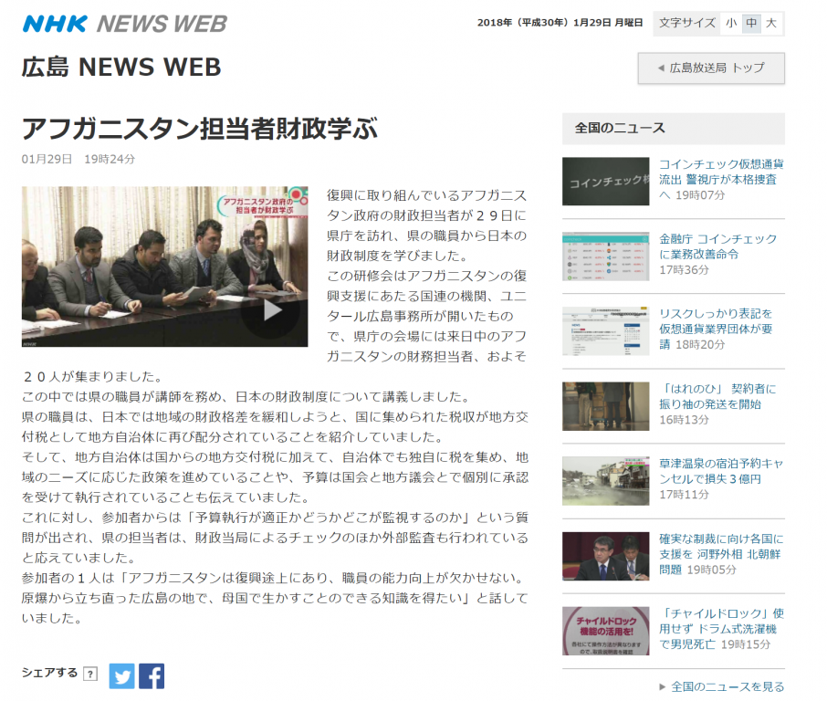 7 February 2018, Hiroshima, Japan - As a part of the UNITAR Public Financial Management Capacity Building Training Programme, the UNITAR Hiroshima Office organized and successfully completed a Study Tour for 19 officials, including 8 females, from Afghanistan’s Ministry of Finance. The overall objective of the study tour was to enhance the participants’ understanding of Public Financial Management practices in the areas of accounting, financial reporting, budgeting and audit by reviewing global good practice, international standards, recent developments, and other countries practices, in particular the budgetary cycle in Japan, so that these could be applied in their day-to-day work and inform their decision making. The study tour was held in Tokyo and Hiroshima, Japan between 24 January and 1 February 2018.