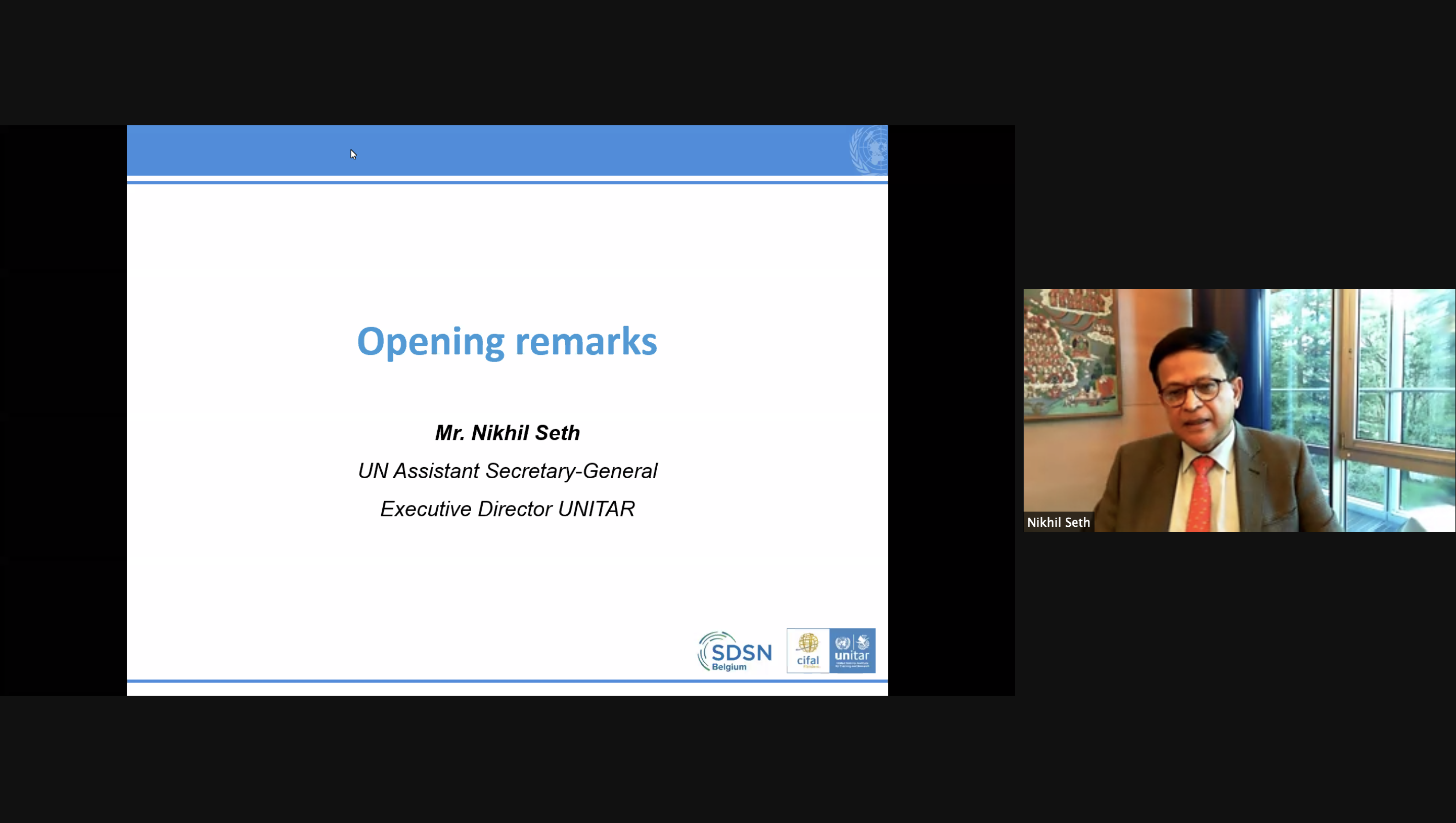 UNITAR’s Executive Director, Mr. Nikhil Seth, provided the opening remarks of the event and stressed that the SDGs are the ideal framework to guide the recovery from COVID-19. The crisis calls for a recovery driven by transformative public investments, and according to Mr. Seth, the world urgently needs a transition in five areas: health systems, energy systems, agriculture, education, and urban settlements. Mr. Seth further indicated that the European recovery plans provide a historic opportunity to invest in the future. The Agenda 2030 provides a framework for this future and should form the foundation of the recovery plans.