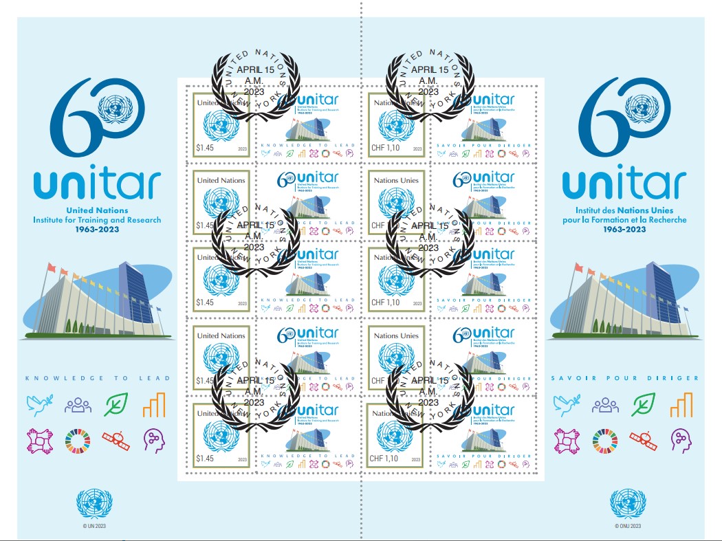 24 May 2023, New York, USA – The United Nations Institute for Training and Research (UNITAR) has reached a significant milestone in its illustrious history, marking 60 years of empowering individuals and strengthening capacities for sustainable development. To commemorate this momentous occasion, UNITAR has released a series of beautiful commemorative stamps that reflect its rich legacy, global impact, and unwavering commitment to fostering knowledge and expertise worldwide. This stamp edition is the second UNITAR stamp after the first one issued in 1969 by the UN Postal Service.