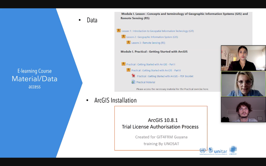 After an extensive training needs assessment, UNOSAT has developed activities targeting stakeholder groups who are working with disaster risk reduction activities across different governmental institutions in Guyana. In order to adapt to the COVID-19 prevention measures and ensure that these activities are delivered in a safe and yet efficient manner, the training was delivered in the form of an e-learning moderated course.
