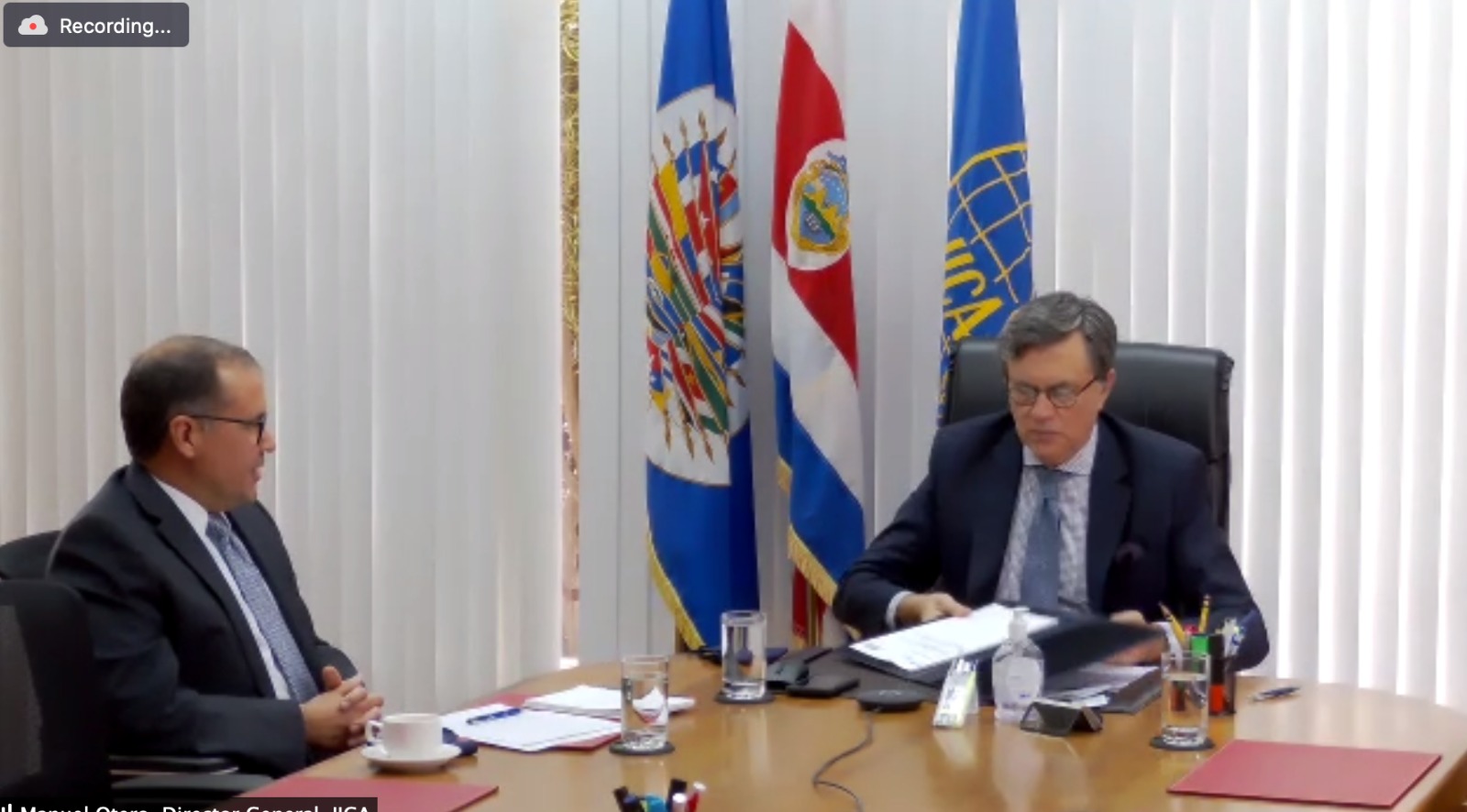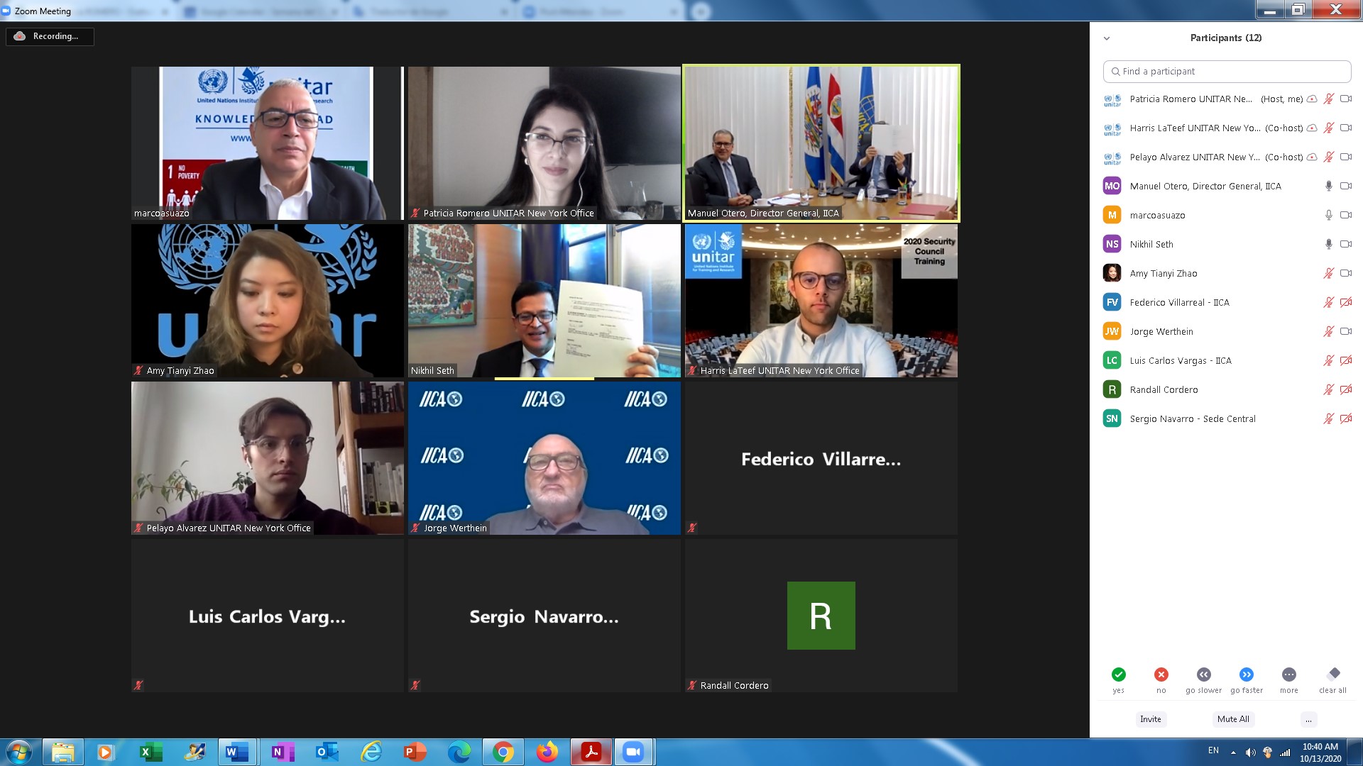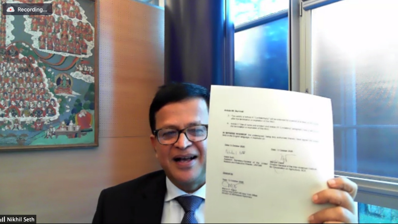 13 October 2020, Costa Rica, New York, and Geneva – The United Nations Institute for Training and Research (UNITAR) and the Inter-American Institute for Cooperation on Agriculture (IICA) represented by the Executive Director, Mr. Nikhil Seth, and the Director-General, Mr. Manuel Otero, respectively, participated in the first virtual signature of a Memorandum of Understanding (MoU) together with the Head of UNITAR New York Office, Mr. Marco Suazo. The newly signed MoU highlights the points of cooperation between the two Parties and their common objectives and goals. In addition, based on the spirit of collaboration, it strengthens the framework within activities that will be developed and implemented for the benefit of participants. Together, the Directors agree on working on projects and training focused on global issues such as climate change, empowerment, sustainability, energy, and more.