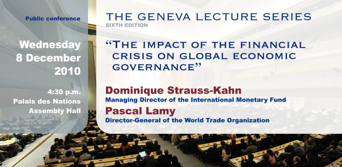 General public from Geneva and beyond is invited to an event that will feature Mr. Strauss-Kahn, IMF Managing Director, and Pascal Lamy, WTO Director-General, and will be entitled “The impact of the financial crisis on global economic governance”. The financial crisis that erupted in 2007 brought about growing realization of the need to reshape the system of international regulation and governance in order to adjust current strategies to stable and sustainable growth requirements, and reportedly accelerated the pace of reforms of international financial and economic institutions created in the aftermath of World War II.