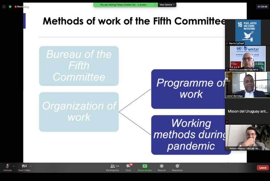 The first day of the training kicked off at 9:00 am (EST). Serving as an introductory course, the session covered topics such as responsibilities, and the key players of the Fifth Committee. Mr. Marco Suazo, Head of UNITAR Office in New York office delivered his welcoming remarks in the beginning of the session. He encouraged delegates to take advantage of this training series as a great resource to prepare them for their work in the Fifth Committee.
