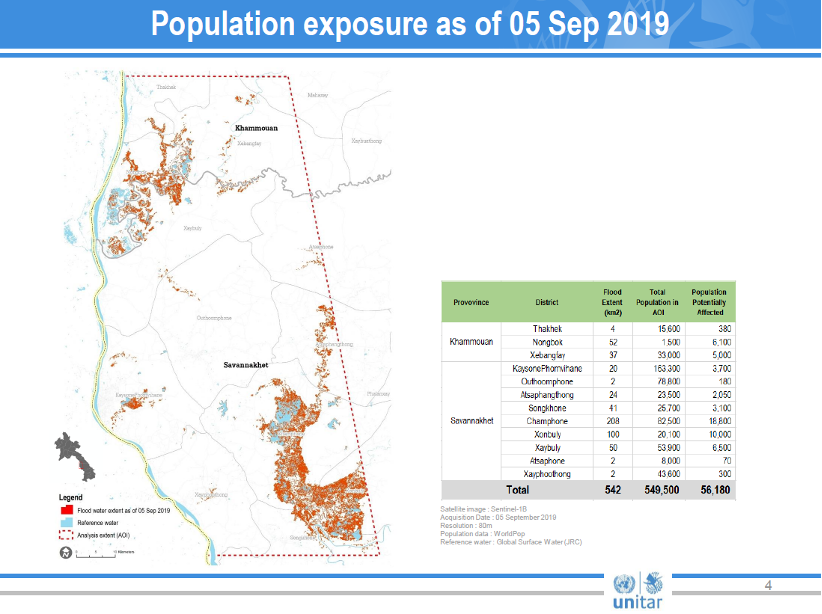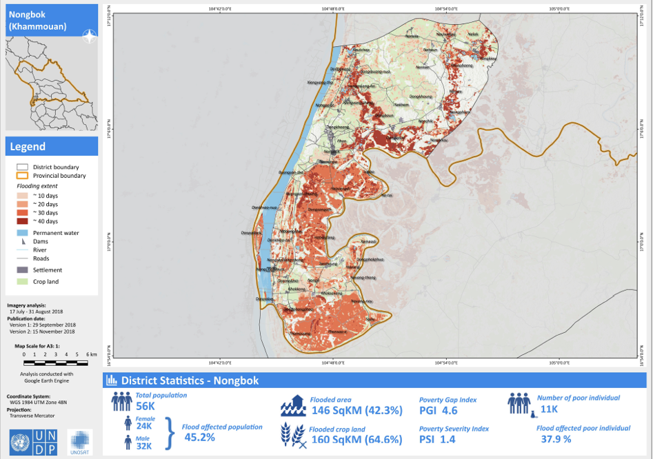 Effects of the floods were still felt weeks after the collapse of the dam. In mid-September, upon request from the Government of Lao PDR and the United Nations Development Programme (UNDP) country office, UNOSAT’s Asia-Pacific regional office carried out big data analytics to determine the damage due to flooding. This supported the UNDP-funded Post Disaster Needs Assessment (PDNA), in particular, because UNDP saw the need and recognized the benefit of additional imaging facilities for the identification of the exact locations, duration, and impacts of the flood event. The technical backstopping project had two main requests, the first on identifying flooding extent with timeline, and second on identifying potential damages from flooding to support the PDNA field missions. The analysis results and emergency response products assisted in setting the baseline for the PDNA analytical assessment and support activities.