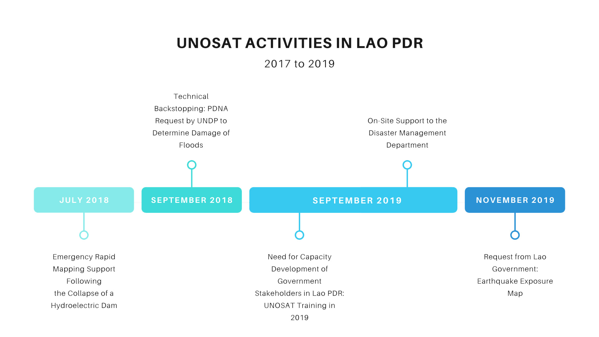 Due to the tropical climate and the unique topographic characteristics, Lao PDR is exposed to a range of hazards that often results in devastating catastrophes. More than 80 percent of its population lives in rural areas in vulnerable conditions where two-thirds of them rely on agriculture. In recent years the country is experiencing devastation from flooding almost every year. In addition to this, Lao PDR suffered from a 6.1 magnitude earthquake in November 2019 and, according to global hazard assessment systems, the country is exposed to medium seismic hazards, which is likely to translate into high risk due to vulnerable buildings and infrastructure. UNOSAT has provided rapid mapping services for the 2018, 2019 flood, and 2019 earthquake, but the post-disaster information can only be fully utilized for smart decision making when operationally integrated into different relevant ministries workflow.
