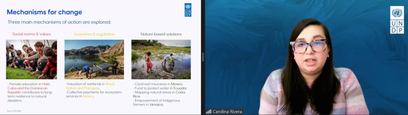Ms. Carolina Rivera, Research Analyst at the HDRO, noted how to enhance the power of unseen and undervalued groups. She used the example of Latin American people in Ecuador. The three mechanisms for change and enhancing equity are: social norms & values, incentives & regulation, and nature-based solutions.