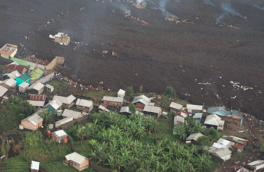 The lava flows emerged from vents north of Goma, a city of 2 million inhabitants, and stopped 700 meters from the airport, destroying over 1400 houses on its path and killing several people. With lava so close to its runway, the airport had to be closed, despite being the main entry point for international aid. The water waste plant was also buried by lava. The displacement of the population, limited access to clean water, and the general lack of emergency resources are big concerns.