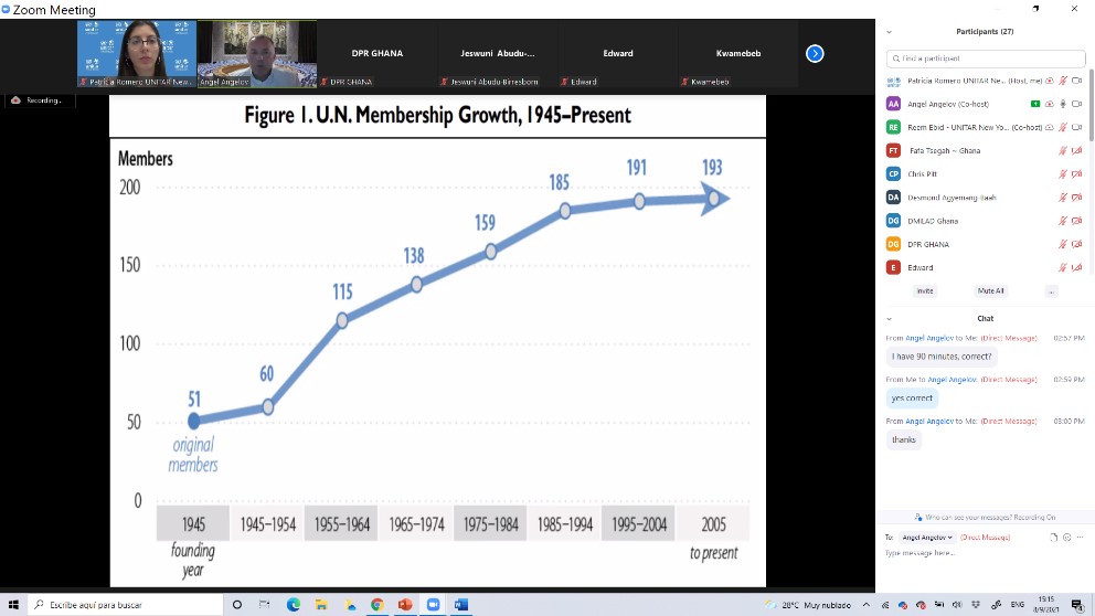 The programme then moved and Dr. Angel Angelov, UNITAR facilitator, discussed the two types of players in the General Assembly which are Member States and Groups. He explained what States are, presented a UN membership growth graph, and explained the history behind the UN memberships. Also, he added how countries applied and how Member States managed to balance and accept them. Dr. Angelov briefly went through how the first Sub-Saharan country was accepted as a UN member. He talked about Observer Missions and moved on to discussing the Groups. He talked about Member States and how important they are to the Security Council either permanent or non-permanent members. An interactive Q&A Session took place afterwards.