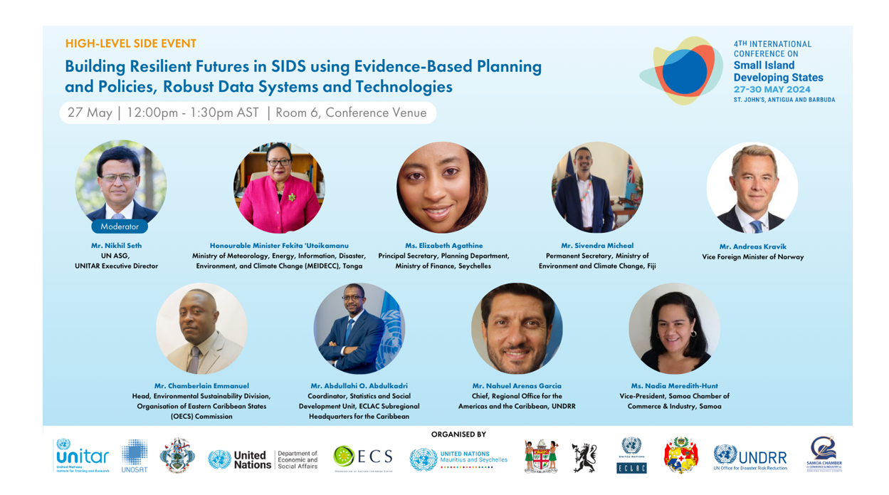 UNITAR and its partners, including the Governments of Seychelles, Tonga, Fiji, Norway, OECS, UNDESA, RCO for Seychelles and Mauritius, ECLAC, UNDRR, and Samoa Chamber of Commerce & Industry, invite attendees to engage in this vital conversation aimed at enhancing SIDS' resilience through evidence-based approaches and technological innovations.