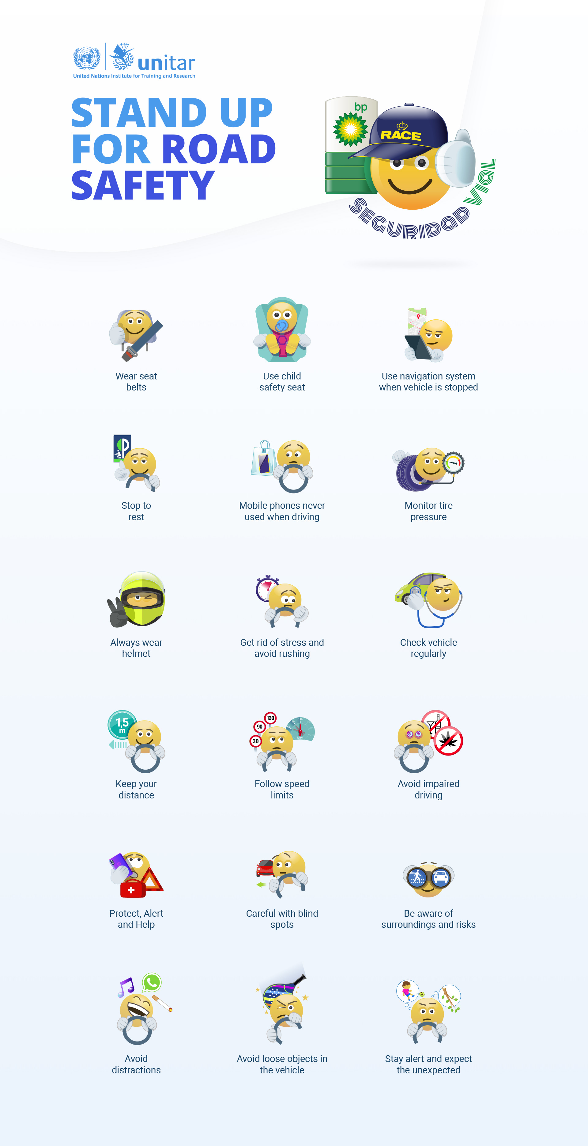 16 July 2020, Geneva, Switzerland – UNITAR is pleased to present the Emoji Campaign “Stand Up for Road Safety” developed with the support of BP and the Royal Automobile Club of Spain (RACE) to promote respect of traffic rules and good road safety behavior by all road users.