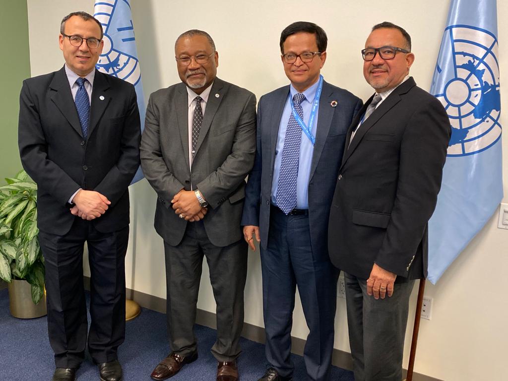Another productive meeting was with Mr. Rudolph Michael Ten-Pow, Chair of the G77 and Ambassador of Guyana to the United Nations, Mr. Murad Ahmia Executive Secretary of the G77, and Ambassador Niel Pierre of the Guyana team. At that meeting, it was agreed to develop the idea of technical training at the expert level for the G77 member countries as well as at the national level for the diplomats of the Government of Guyana. It was an excellent opportunity in which the Executive Director mentioned the different offers made by UNITAR on training, workshops, and courses tailored to the needs of each State, detailing the four pillars on which the work of UNITAR is based such as Peace, People, Planet and Prosperity.