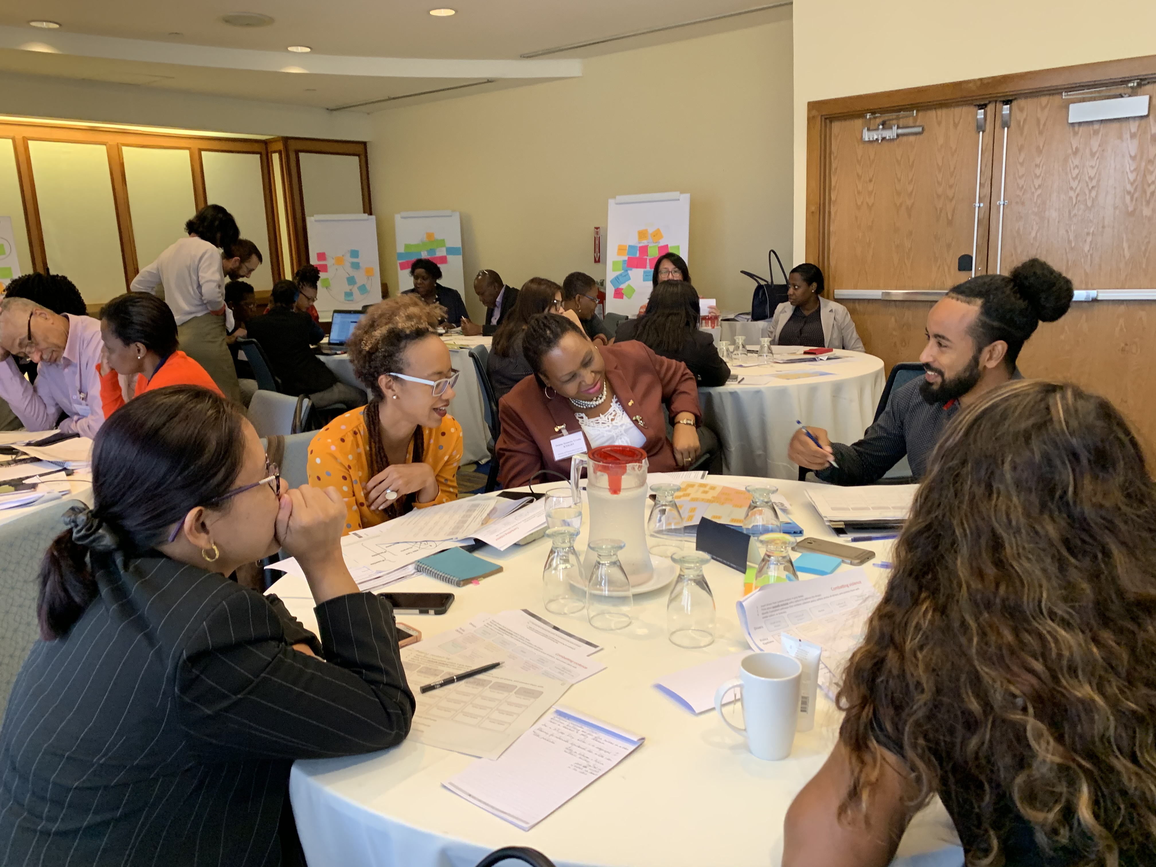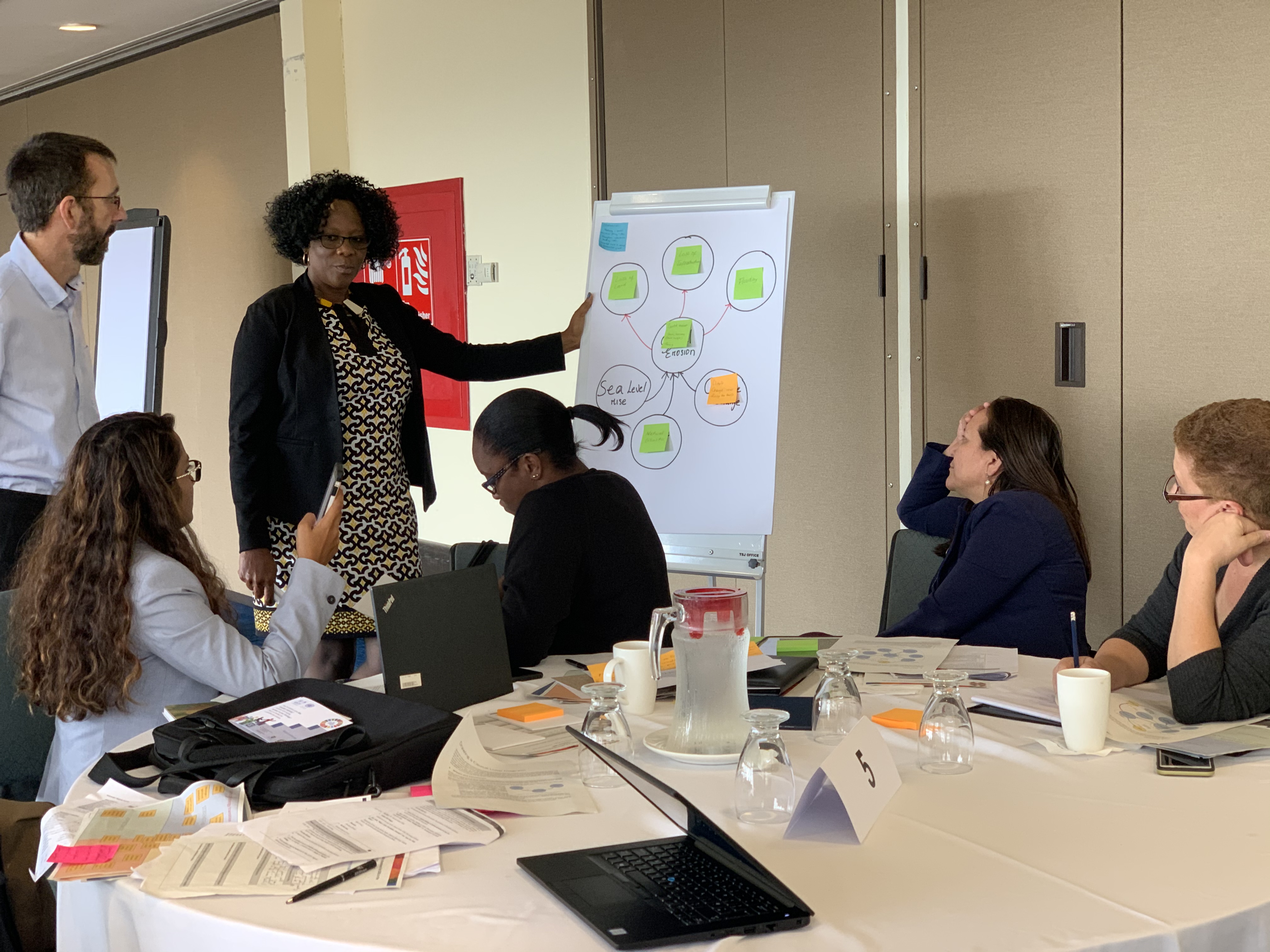 A joint team of resource persons composed of the repsenrestatives of ECLAC, UN DESA and UNITAR has facilitated the workshop, including Mr. Francois Fortier, Mr. Abdullahi Olabode Abdulkadri and Ms. Catarina Camarinhas from ECLAC, Ms. Veronique Verbruggen from UN DESA and Ms. Elena Proden and Ms. Madina Imaralieva from UNITAR. The methodlogy combined short theoretical introductions with case studies and hands-on activities involving the development of system maps showing the complex linkages between a selected entry point and root causes and possible interventions. It also provided space for countries to interact and share and learn from each other’s experiences.