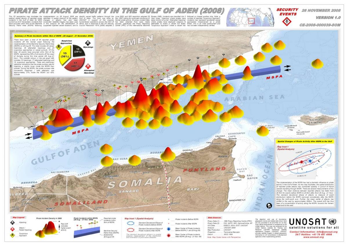 UNOSAT conducts studies on piracy activity and produces geospatial analysis used mainly by humanitarian users and in response to UN Security Council and IMO Resolutions on piracy. These studies are part of the activity undertaken by UNOSAT in the areas of applied research for human security.