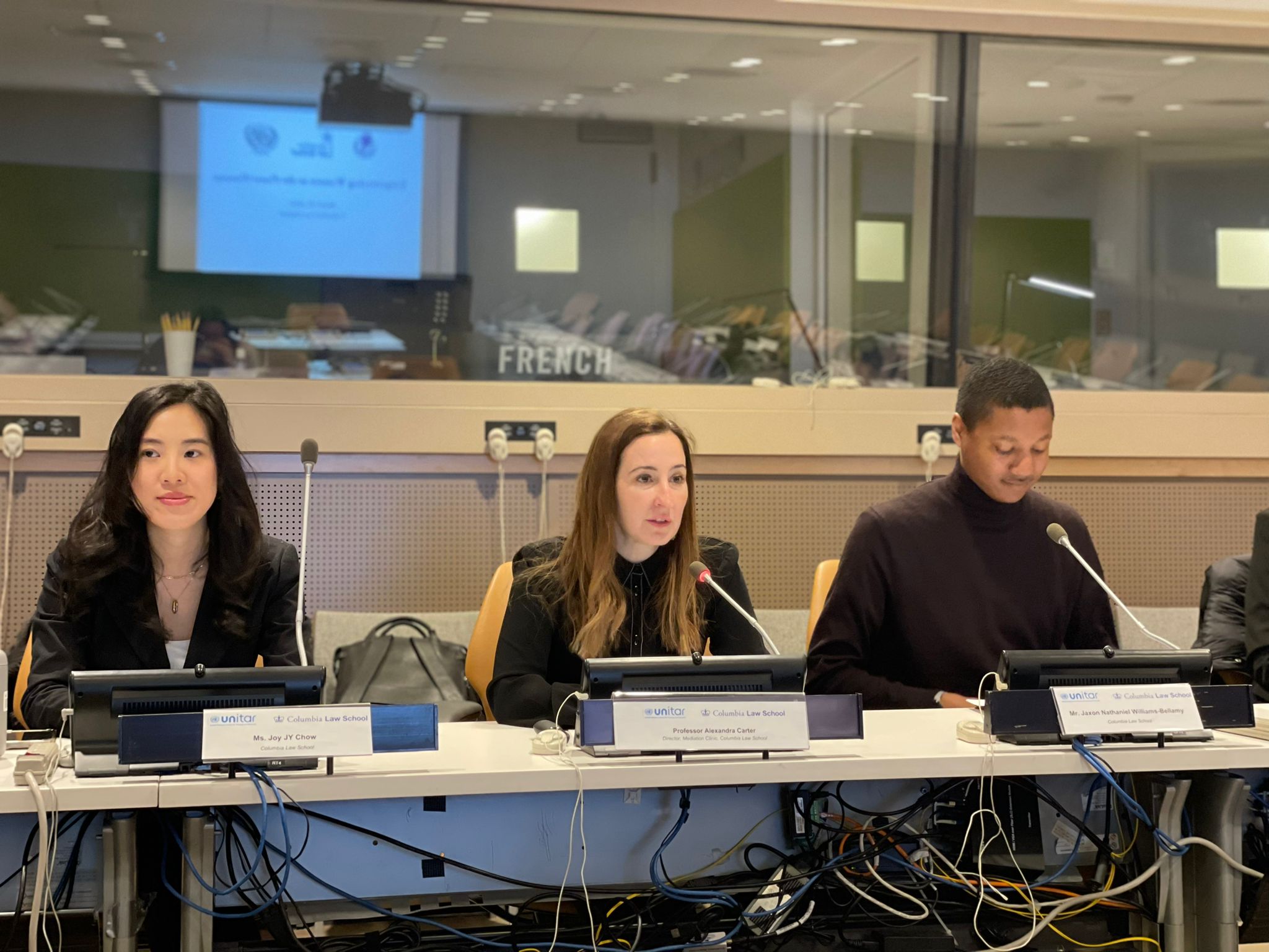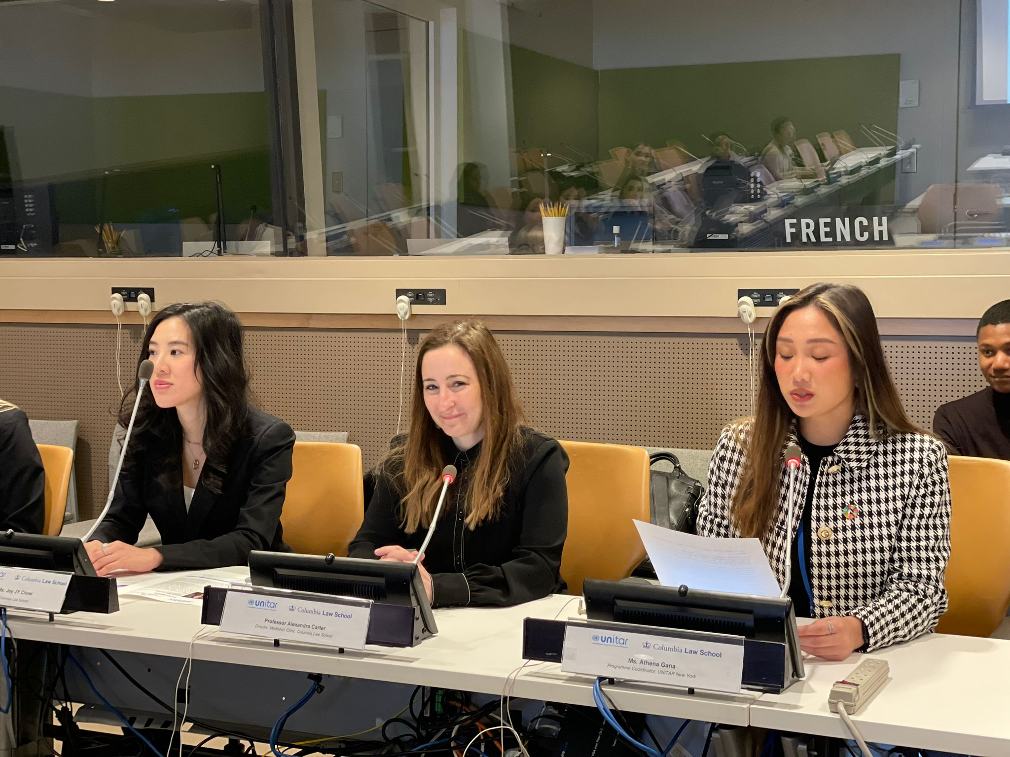 25 March 2024, New York, USA - UNITAR and Columbia Law School launched the spring 2024 iteration of one of UNITAR´s longest partnership programmes, The Columbia University Law School Series, with the first session titled "Empowering Women in the Peace Process". UNITAR Project Coordinator, Ms Hannah (Athena) Gana opened remarks on behalf of Mr Marco Suazo, Head of the UNITAR Office in New York, with a powerful statement on engaging in discourse and listening to the experiences of women, particularly in spaces predominantly male. Professor Alex Carter, Director of Columbia Law School's Mediation Clinic, began with her remarks on this longstanding series and the fruitful partnership between UNITAR and Columbia Law School. She then proceeded to introduce the Columbia Law School team that will deliver the day's presentation.