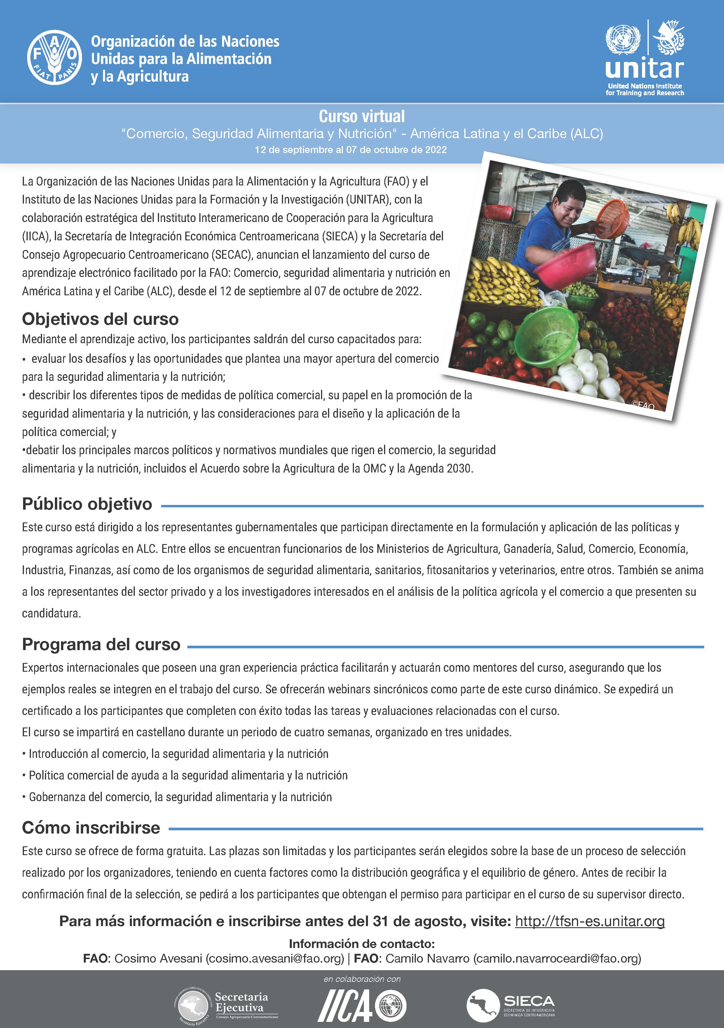 This course is offered free of charge as part of FAO’s support to Member countries and will be organized in three units and conducted in Spanish language over a period of four weeks. This course will be delivered online via UNITAR’s e-learning platform and will take place from September 12 to October 7, 2022.