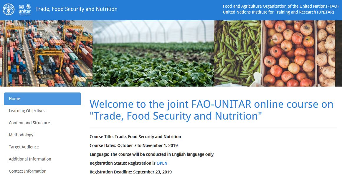 By the end of the course, participants will be able to assess the challenges and opportunities posed by greater openness to trade for food security and nutrition, describe different types of trade policy measures and considerations for trade policy design and implementation as well as discussing the key global policy and regulatory frameworks governing trade, food security and nutrition, including the WTO Agreement on Agriculture and Agenda 2030.