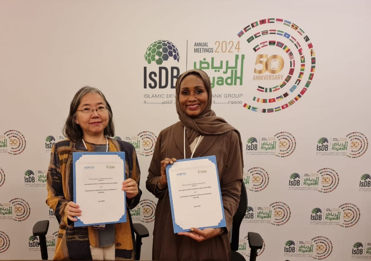 23 May 2024, Hiroshima, Japan – On 27 April 2024, UNITAR signed a memorandum of understanding with the International Center for Biosaline Agriculture (ICBA) at a ceremony held at the 2024 Islamic Development Bank Group Annual Meetings in Riyadh. The memorandum was signed by Dr. Tarifa Alzaabi, Director General of ICBA, and Ms. Chisa Mikami, Head of UNITAR Hiroshima Office, Division for Prosperity.