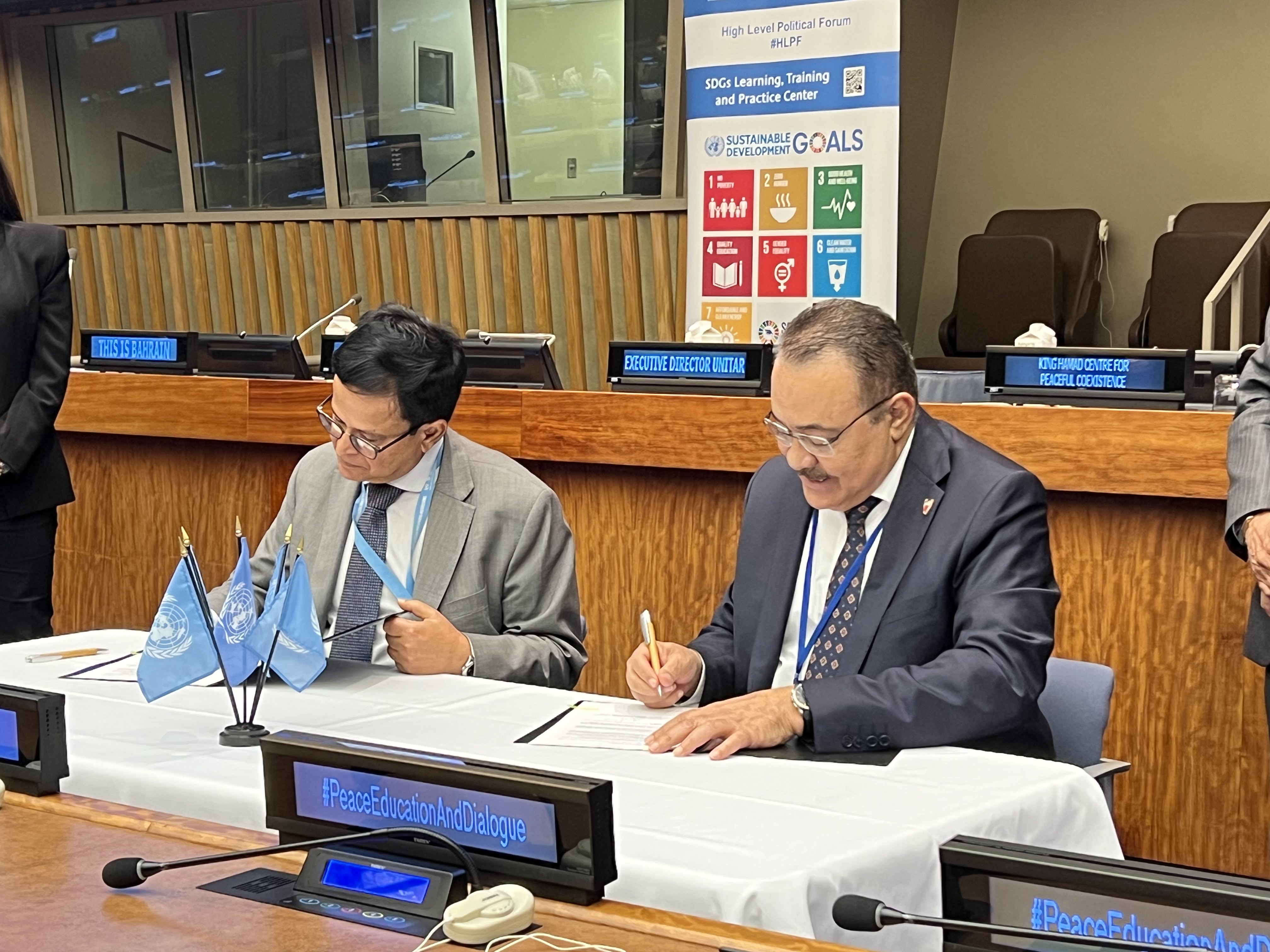 The event ended with Mr. Seth and H.E. Dr. Shaikh Khalid bin Khalifa Al Khalifa signing together the Memorandum of Understanding between UNITAR and King Hamad Global Centre for Peaceful Coexistence. This Memorandum of Understanding aims at providing a cooperative framework within which the Parties can develop and implement educational programmes and related activities. Both UNITAR and the King Hamad Global Centre for Peaceful Coexistence intend to utilize and leverage their existing resources and facilities for mutual benefit, and for the benefit of the activities’ beneficiaries.