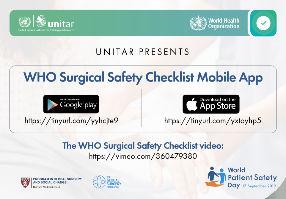 17 September 2019, Geneva, Switzerland – The United Nations Institute for Training and Research (UNITAR), the World Health Organization (WHO), the United Nations International Computing Center (UNICC) and the Harvard Medical School Program in Global Surgery and Social Change (PGSSC) are partnering to promote a new mobile application for the WHO’s Surgical Safety Checklist, which is destined to facilitate its use among healthcare professionals. The dissemination of the mobile feature is enhanced through a video that aims of raising awareness of the Checklist’s importance and added value.