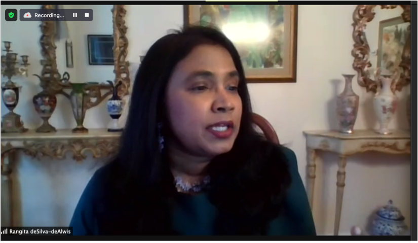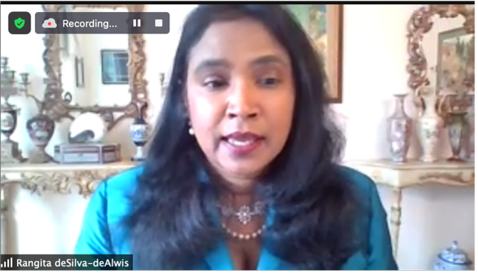 The third day of the series was again opened by Mr. Alvarez of UNITAR NYO, which focused on Women, Peace and Security. Prof. de Silva de Alwis spoke about the UN Security Council Resolution 1325, which recognized that women were not only victims of war but also agents for peace. She then introduced Ambassador Melanne Verveer, who returned for the third seminar of the series. Ambassador Verveer highlighted that the condition of women and the condition of nations goes hand-in-hand, mentioning the exacerbation of conflict when women are not treated equally. She advocated for the need to specifically address sexual violence as a tool of war and likened this to international conventions on weapons of mass destruction. Ambassador Verveer also mentioned the impact of COVID-19 on women and spoke of the rise in domestic violence, economic dislocation, and rates of lost educational opportunities.