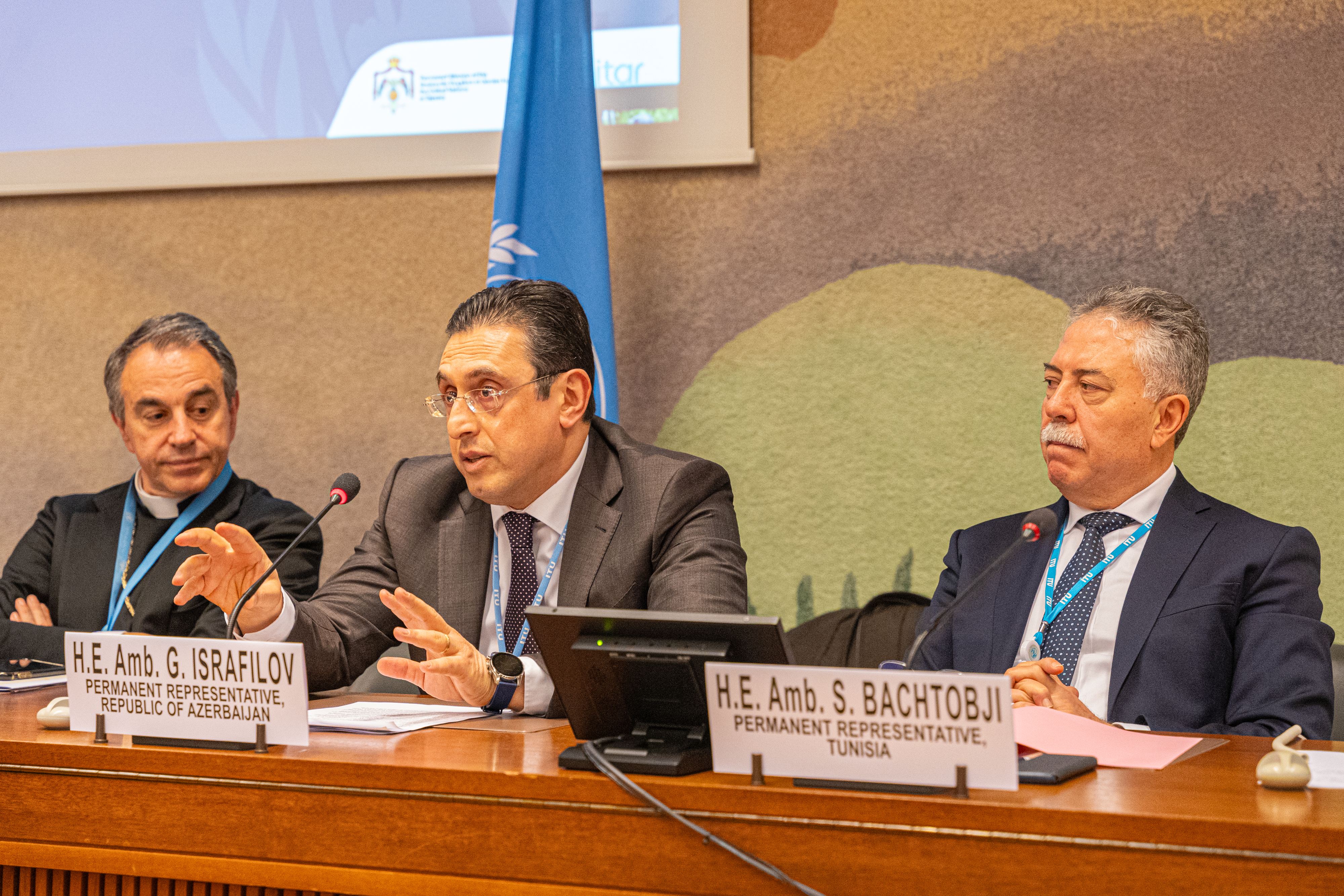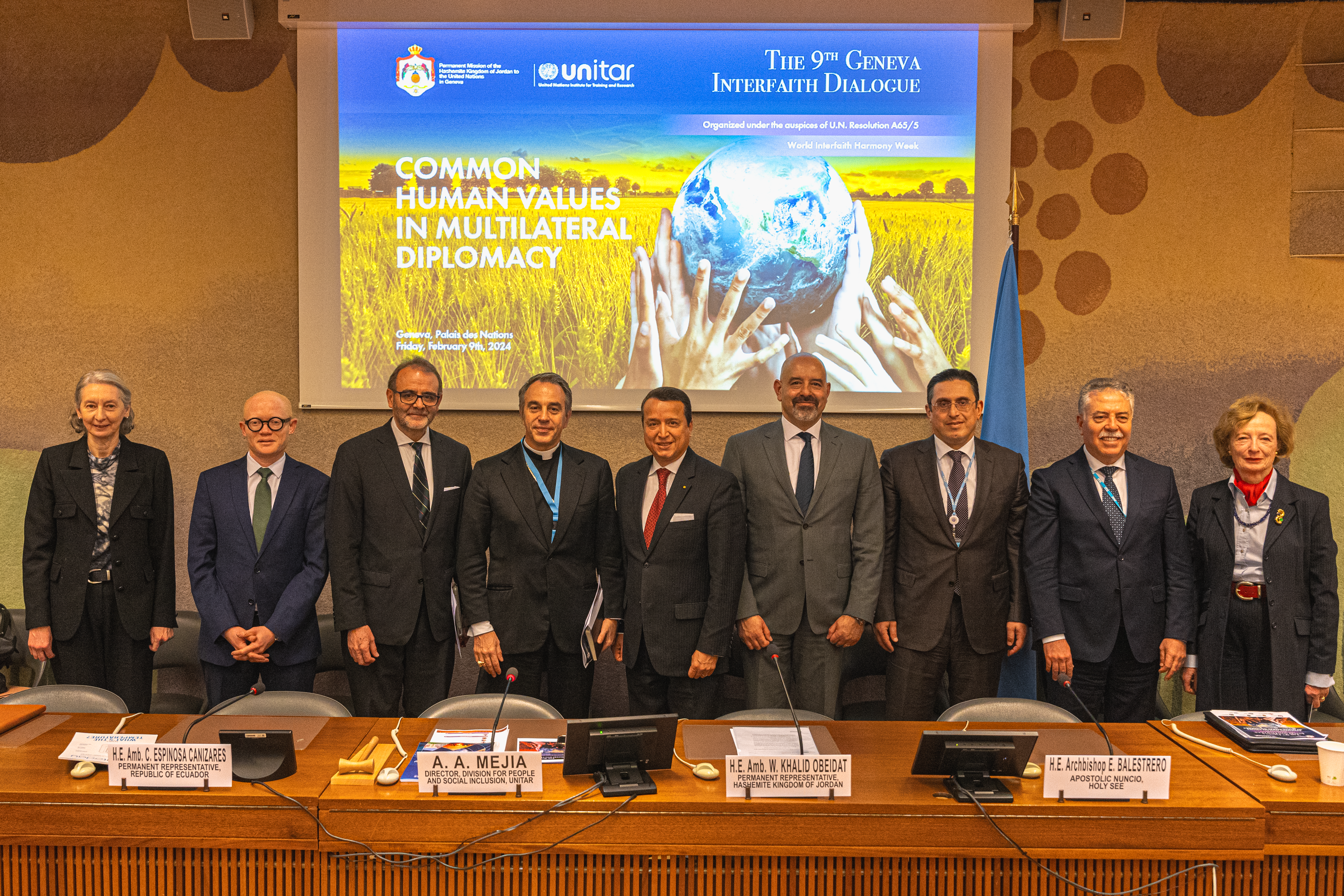 The 9th Annual Geneva Interfaith Dialogue brought together the following speakers: Amb. Khalid Walid Obeidat, Permanent Representative of the Hashemite Kingdom of Jordan; Amb. Galib Israfilov, Permanent Representative of the Republic of Azerbaijan; Amb. Sabri Bachtobji, Permanent Representative of Tunisia; Amb. Cristian Espinosa Canizares, Permanent Representative of the Republic of Ecuador; Amb. Abdallah Saleh Possi, Permanent Representative of the United Republic of Tanzania; Archbishop Ettore Balestero, Apostolic Nuncio of the Holy See; Amb. Maria Therese Pictet-Althann, Permanent Observer of the Sovereign Order of Malta; and Amb. Nassima Baghli, Permanent Observer of the Organization of Islamic Cooperation.