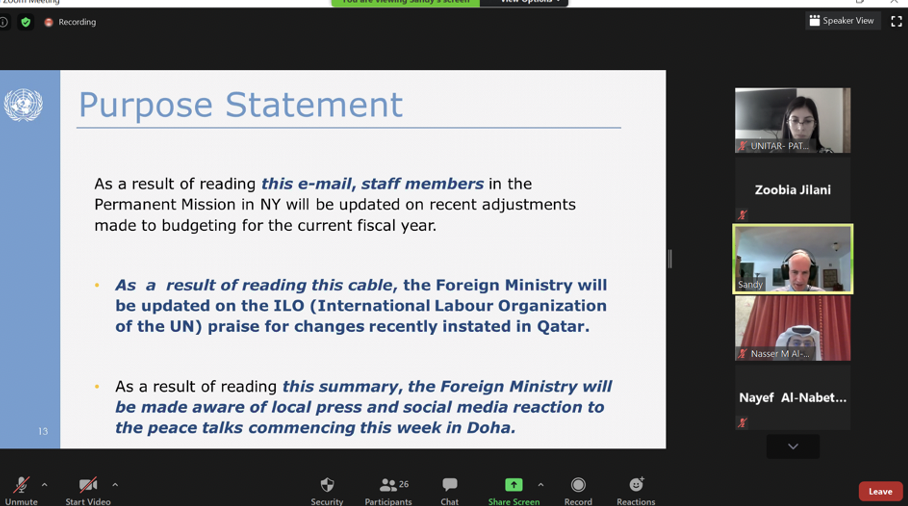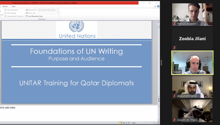 16 September 2020, New York, USA, Video Conferences - The United Nations Institute for Training and Research New York Office (UNITAR NYO) rolled out its “Foundations of UN Writing” course on 16 September. This training is designed to prepare the diplomatic staff of the Permanent Mission of Qatar to the United Nations with the necessary knowledge of guidelines and best practices for writing while performing their duties at the United Nations.