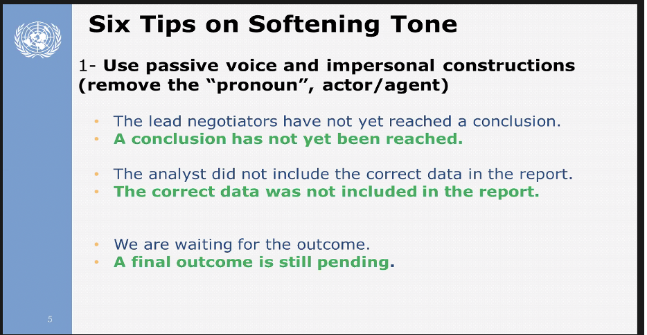A short break commenced after Part Two, which was followed by a discussion of how to effectively communicate potentially negative or critical opinions without damaging diplomatic relations. Choosing positive and/or neutral construction and vocabulary was highlighted as an optimal path forward. Singer also covered six tips of softening the tone of one’s writing which included the following: use passive voice and impersonal construction, use euphemisms & words that leave room for interpretation, add qualifiers, hedges, and other softeners, use less negative language and ensure the language is gender-sensitive.