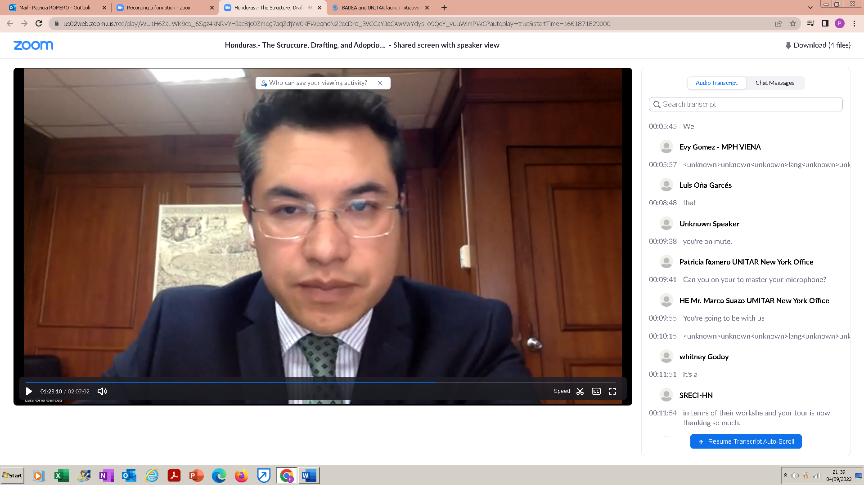30-31 Agosto 2022, Nueva York, USA – El Instituto de Naciones Unidas para la Formación e Investigación (UNITAR), oficina de Nueva York, organizó el taller sobre Redacción de Resoluciones de manera virtual para apoyar a los diplomáticos hondureños. Atendieron más de 100 diplomáticos de carrera de la Secretaría de Relaciones Exteriores y Cooperación Internacional desde sus diferentes embajadas, consulados y oficinas acreditadas, los cuales contribuyeron a que las sesiones de dos días marcaran un fructífero programa.