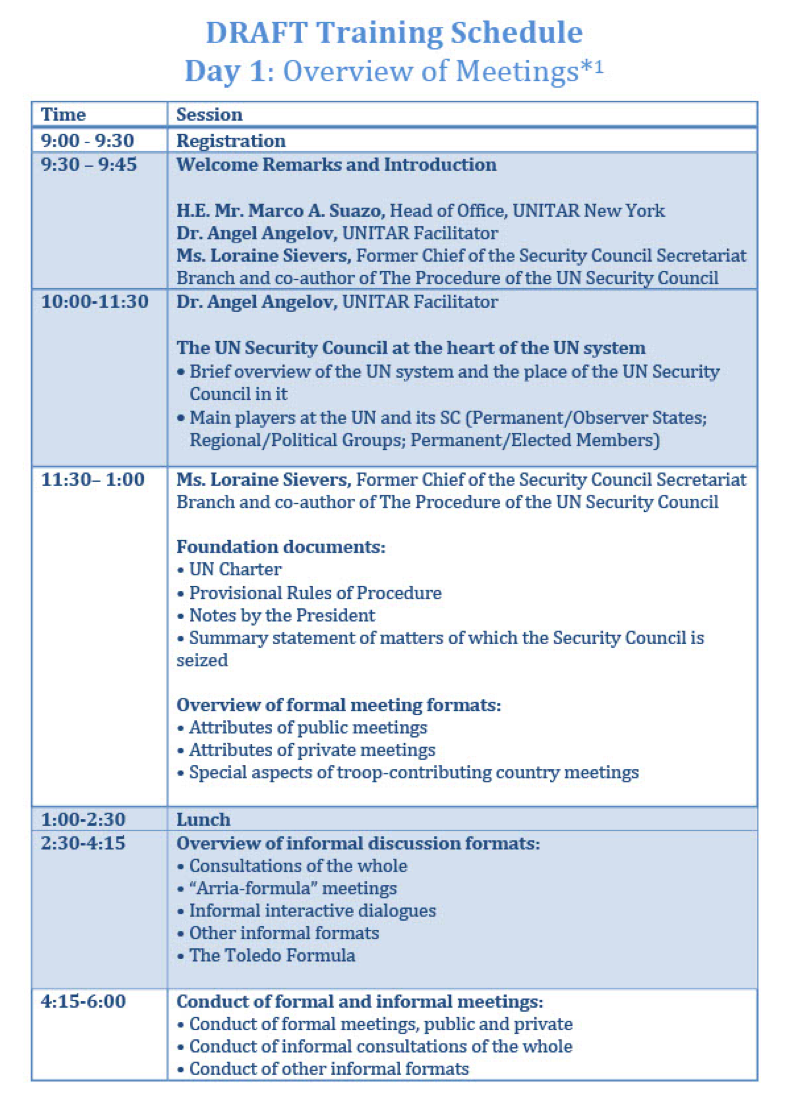 23 October 2019, New York, USA – The United Nations Institute for Training and Research’s (UNITAR) New York Office kicked off the first of a series of workshops that will be held for the newly elected members of the Security Council for the 2020-20201 period: Tunisia, Niger, Vietnam, St. Vincent and the Grenadines and Estonia. The two and a half day training sessions will take place between 21 October and 15 December 2019, and cover the following topics; the role of the Security Council in the UN System, Foundational Documents, informal and formal meetings, documents Council members create and receive, the Presidency, Security Council practices, the Security Council relationship with the General Assembly, and the Subsidiary Organs of the Security Council. The five training courses will be led by the following instructors; Ms. Loraine Sievers, Former Chief of the Security Council Secretariat Branch and co-author of The Procedure of the UN Security Council; Mr. Larry D. Johnson, Former Assistant-Secretary-General for Legal Affairs; Mr. Bojan Stefanovic, Political Affairs Officer in the Security Council Practices and Charter Research Branch of the Security Council Affairs Division; Mr. Davey McNab, Senior Political Affairs Officer, Security Council Subsidiary Organs Branch, SCAD; and Dr. Angel Angelov, UNITAR staff as facilitator’s and other qualified panelists, as per request or need.
