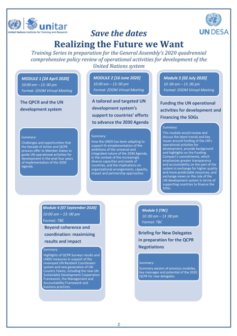 The 1st Module of the QCPR sessions will also take place via zoom on Friday the 24th of April. This fist module will focus on QCPR and the United Nations Development System, going through the United Nations Challenges and opportunities that the Decade of Action and QCPR process offer to Member States to guide UN operational activities for development in the next four years of implementation of the 2030 Agenda.