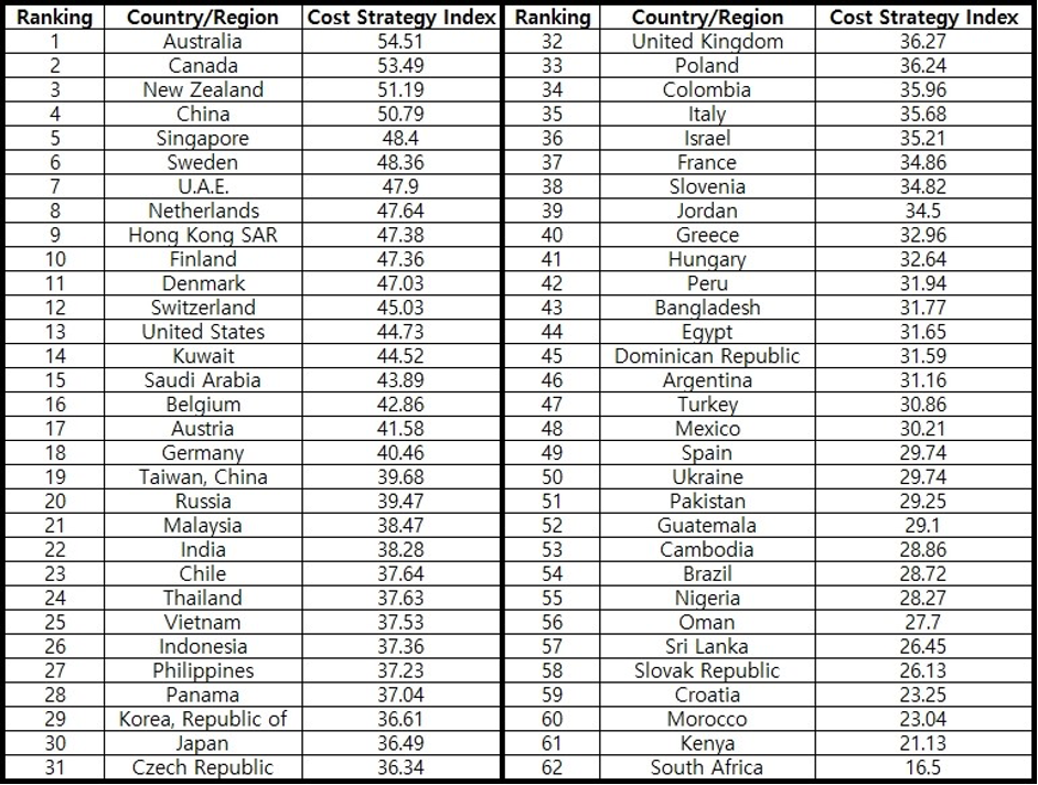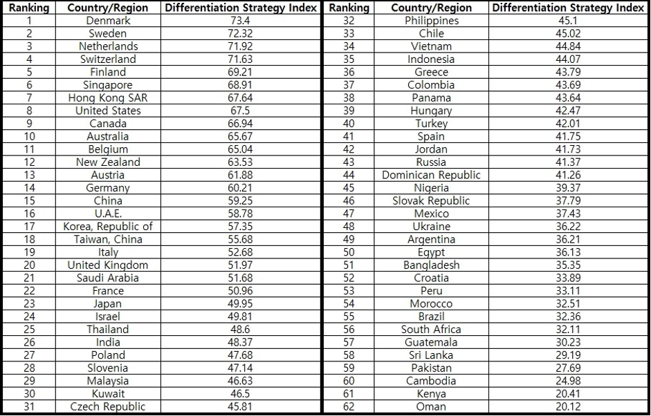 For example, Switzerland falls to 12th place when it uses a low-cost strategy, but rises to 4th place when it adopts a differentiation strategy. Such a dramatic change can be explained by the fact that Switzerland is already an advanced economy that can produce high-quality products. But Switzerland has a chance for further improvement in national competitiveness.