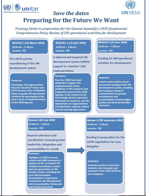 10 February 2020, New York, USA – This year, UNITAR Office in New York, the Permanent Mission of Switzerland, and the United Nations Department of Economics and Social Affairs (UNDESA) will present 5-module “Realizing the Future We Want – Training series in preparation for the General Assembly’s 2020 Quadrennial Comprehensive Policy Review (QCPR) of the operational activities for development of the United Nations system” from March to September 2020.