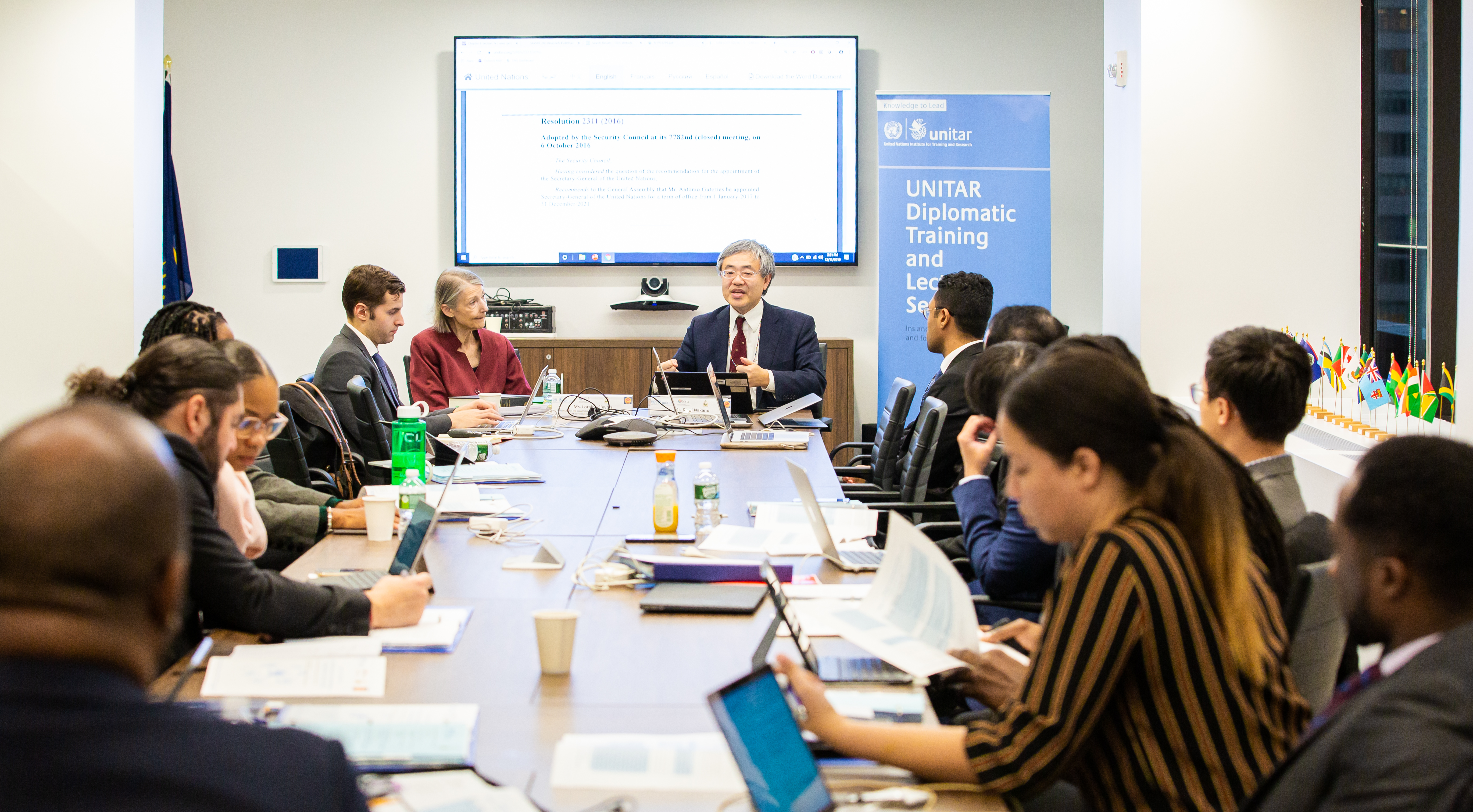 The training covers the following topics- the Role of the Security Council in the UN System; Foundational Documents; informal and formal meetings, documents Council members create and receive; the Presidency; Security Council practices; the Security Council relationship with the General Assembly, and the Subsidiary Organs of the Security Council. The training includes sessions by Ms. Loraine Sievers, Former Chief of the Security Council Secretariat Branch and co-author of ‘The Procedure of the UN Security Council’; Mr. Bojan Stefanovic, Political Affairs Officer in the Security Council Practices and Charter Research Branch of the Security Council Affairs Division; Mr. Davey McNab, Senior Political Affairs Officer, Security Council Subsidiary Organs Branch, SCAD; Dr. Angel Angelov, UNITAR staff; and Mr. Kenji Nakano, Chief of the General Assembly Branch.