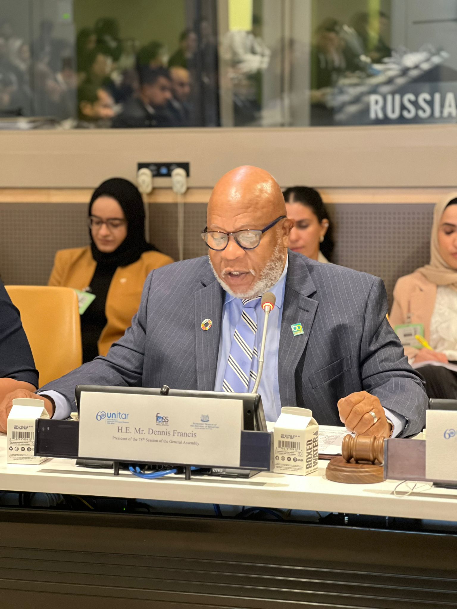 H.E. Mr. Dennis Francis, President of the 78th Session of the General Assembly followed H.E. Mr. Gafoor with his own clear and concise view of the challenges the upcoming session will face and a reminder to delegates to continuously find inspiration from the UN Charter, which guides the work of all UN Bodies. President Francis spoke of his deep faith in the multilateral system, the UN’s pivotal role in promoting it, and the importance of prioritizing the voices of all people and provided his four guiding principles: Peace, Prosperity, Progress, and Sustainability. He also offered reminders to the new delegates to continuously re-evaluate how their work is done, rationalize and streamline the agendas, and avoid disagreements and conflicts that hamper the work wherever possible. He ended with thanks to attendants and organizers and talked about how his team recently benefitted from similar UNITAR training.