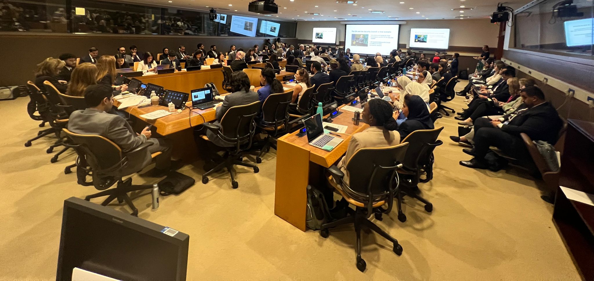 Perhaps an understated aspect of work in the UN is the fact that there is not one single language of operation and documentation. While the UN has six official languages of operation (Arabic, Chinese, English, French, Spanish, and Russian), any speaker can present in any language. The second panel of the final session was about this critical interpretation work and GA documents and research. Ms. Lana Ayyad, Chief of the Arabic Interpretation Section and Ms. Micaela Becquart, Interpreter of, the Spanish Section, Interpretation Service, spoke about the complex channels of interpretation and translation work that happens often live and instantaneously. They clarified that the UN can provide interpretation in the six official UN languages, however, any language may be used, so long as interpretation is provided.