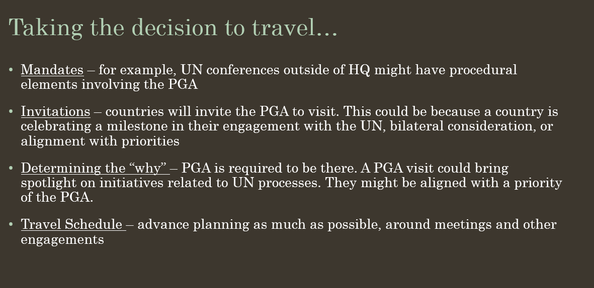 The following speaker Mr. Peter Stone, Deputy Team Leader of the Reform, Legal and Budget Team, covered the financial and budget aspects. Drawing on his experience, he pointed out that the team of the OPGA is pretty much part of the Secretariat once they are in office because the financial and budget implications depend on the UN. The OPGA works for the Member States and financial regulations and procurement apply to them as well. For a simple quotation, come with 3 proposals, he recalled. If the team considers buying something, have the right conversations internally first before speaking to people. One thing on finances to be reminded like anyone authorizing spending money in the office of the PGA should go first to the Chef de Cabinet to have the proper authorization. He also shared the necessity of linking with the GA Branch to get information on schedules, procedures, commemorative days, and more.